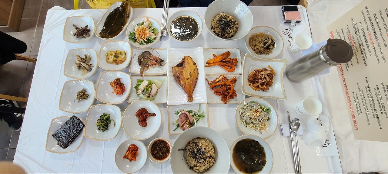 남편이 고른 메뉴는 홍합밥! 홍합살을 발라내어 돌솥에 쌀과 함께 쪄낸 음식이었다. 열 가지가 넘는 반찬과 함께 진수성찬이 차려졌다. 미역국은 시원하고 홍합도 쫄깃쫄깃하고. 이것저것 주워 먹다 보니 배가 금세 차올랐다. 자, 열심히 먹었으니 이제는 걸을 시간. 화장실도 다녀오고, 발목도 한번 돌려주고, 마지막으로 배낭의 허리 버클을 단단히 채우고 여정의 첫걸음을 내디뎠다.