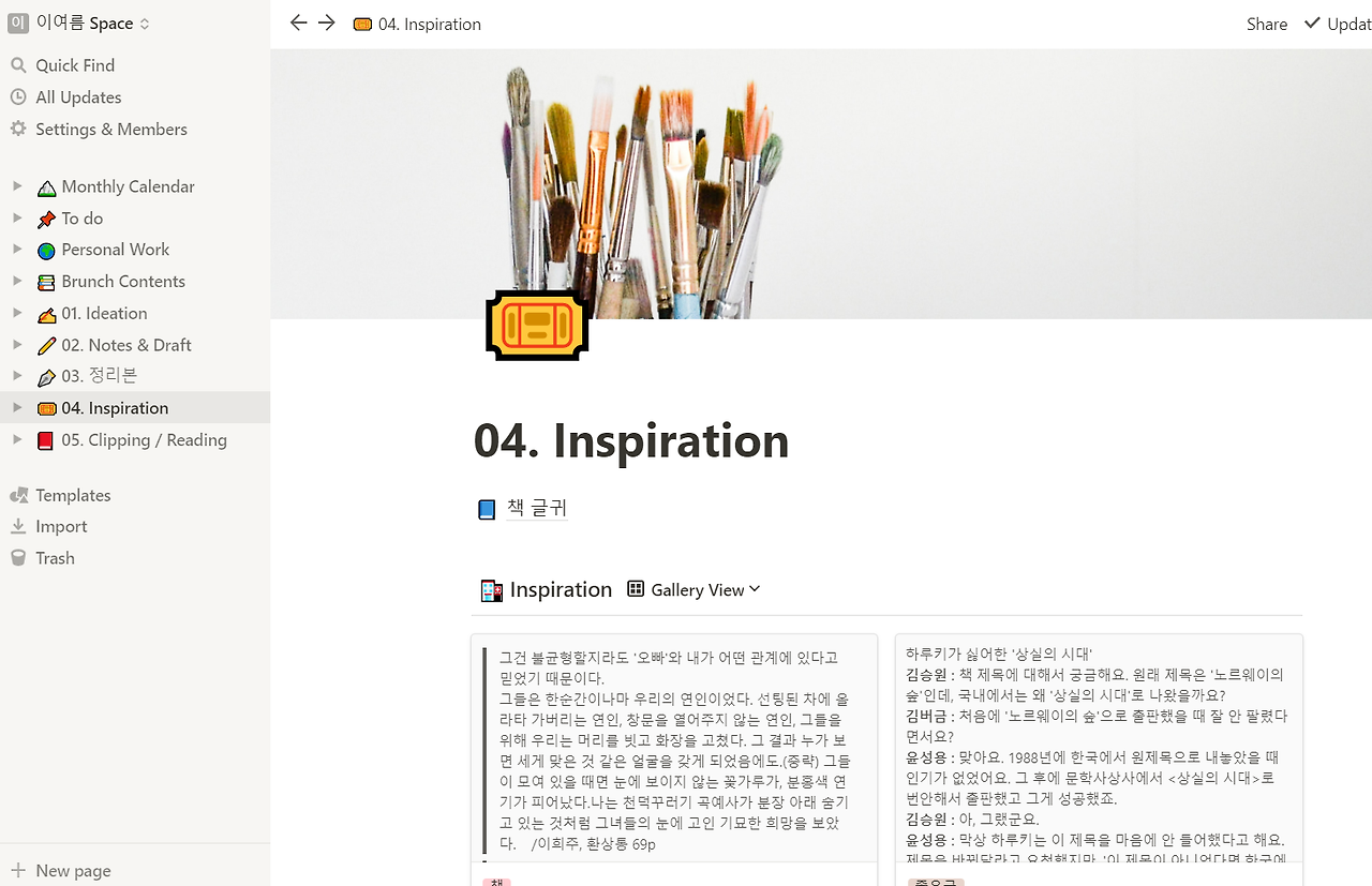 인터페이스는 모두 영어로 되어 있어 낯선 세계에 적응하는 건 쉽지 않았지만 각종 블로그의 노션 활용 사례들과 탬플릿들을 배치한 끝에 나만의 워킹 플레이스를 만들 수 있었다. 그 덕에 몇 년 동안 아이폰 메모장에서 묵어가던 글들도, 스크랩만 해두고 보지 않았던 글들도 한 군데에서 쓱쓱 볼 수 있게 되었다.