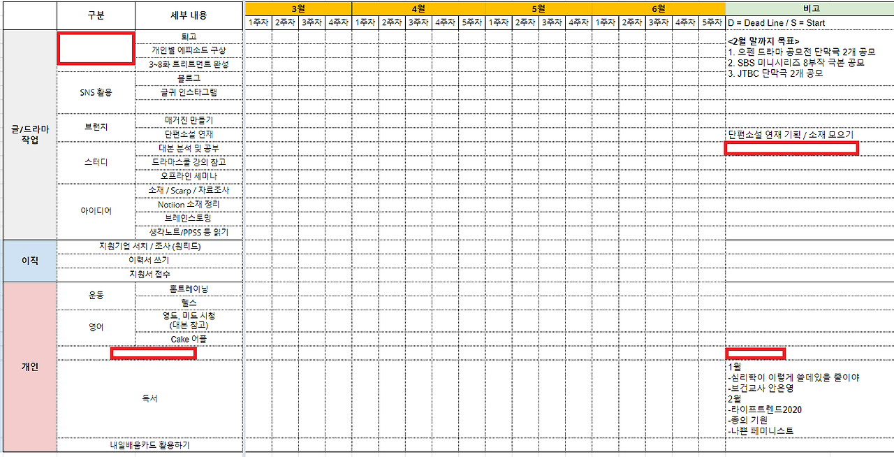 처음 계획을 짜야겠다 마음먹었을 때 만든 게 바로 개인 워크 플로우 시트였다. 회사에서 프로젝트 진행 시에 다양한 팀과 협업이 필요하면, 데드라인 설정과 업무 분장, 투두 리스트 관리를 위해 워크 플로우 시트를 만들곤 했는데, 이걸 개인적으로도 적용해 본 것이다.