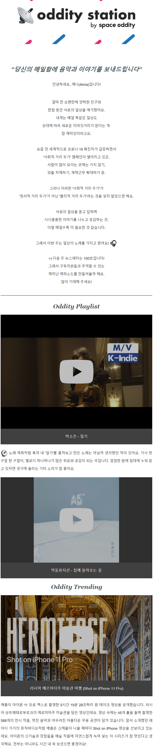 음악 기반의 다양한 콘텐츠를 제작하는 스페이스 오디티에서 발행하는 뉴스레터로 다양한 음악을 추천해준다. 음악에 일가견 있는 전문가들의 추천이라 그런지 들을 음악이 없어 고심할 때면 뉴스레터를 다시 한번 보게 된다. 사실 스페이스 오디티는 '브랜드 마케터들의 이야기'라는 책을 읽고 더욱 관심을 갖게 된 곳인데 이들의 홈페이지를 살펴보면 음악뿐 아니라 마케팅에도 감탄하게 된다. 뉴스레터를 통해 자연스럽게 그들의 콘텐츠를 읽다 보면 어느새 이 곳의 열성 팬이 되어버릴 것 같은.