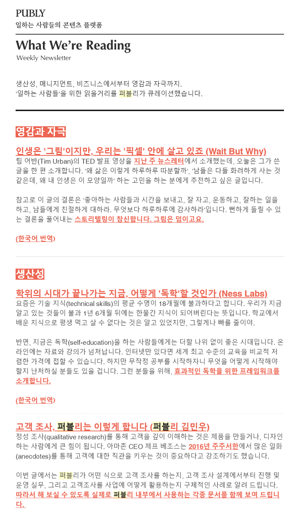 일하는 사람들의 콘텐츠 플랫폼을 표방하는 퍼블리(Publy)의 뉴스레터. 처음 퍼블리가 나왔을 때만 해도 웹의 콘텐츠(특히 글!)를 돈 주고 구매해서 본다는 개념은 익숙하지 않았다. 인터넷 뒤지면 다 나오는데?라는 생각이 팽배했던 시대였으나, 희미했던 저작권 의식에도 새 바람이 불면서 이제는 괜찮은 콘텐츠에 돈을 지불하는 것이 꽤 당연해졌다. 글을 쓰는 사람을 후원할 수 있는 사이트도 생겨났으니. 아무튼 그만큼 퍼블리는 괜찮은 콘텐츠를 다양하게 제공한다. 경제나 비즈니스, 트렌드 등 다양한 분야의 좋은 콘텐츠를 멤버십 제도를 통해 제공하는 퍼블리가 그들의 콘텐츠를 소개하는 뉴스레터. 일을 잘하고 싶은 직장인들에게 도움이 될 것 같다.