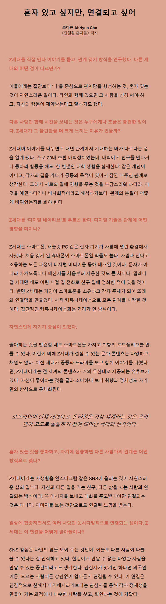 문화, 시사, 정치, 경제, 트렌드 등 다양한 분야의 전문가와의 대담을 싣는다. 현업에 종사하고 있는 이들의 생각을 통해 분야별 트렌드나 흐름을 알 수 있다. 결코 가볍지만은 않은 내용들이다. 사회 전반에 걸쳐 일어나는 현상이나 궁금증을 이해할 수 있어 재밌게 읽고 있다.