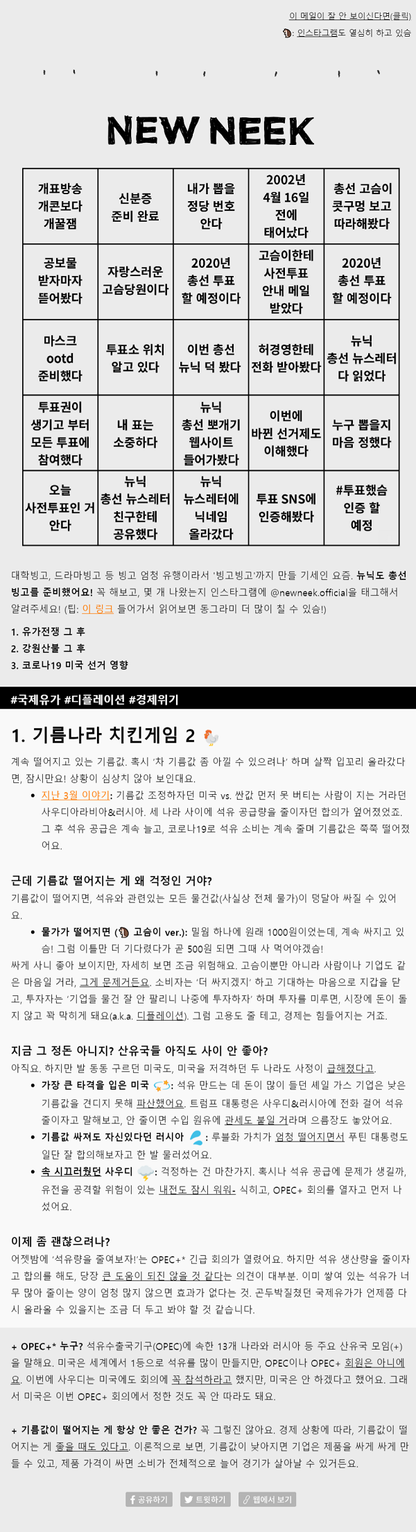 구독 신청 링크를 누르면 나오는 "우리가 시간이 없지, 세상이 안 궁금하냐!"라는 문구가 인상 깊었다. 하루 10분만 투자하면 정치, 경제, 시사의 흐름을 알 수 있다. 귀여운 고슴도치 캐릭터를 내세워 친근하게 사회를 알려준다. 아래의 샘플은 어제 받은 뉴스레터의 일부분이다. 콘텐츠의 양이 생각보다 많아 공부하듯 읽어야 하지만 그만큼 질이 좋다는 느낌이다. 선거를 앞두고 준비한 총선 뽀개기 사이트는 정말 시간 들여 준비한 티가 난다. 투표하기 전에 제대로 정독하고 가야지, 하는 마음으로. 추천!