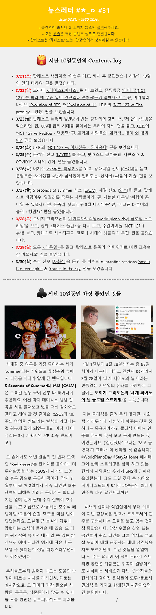 어떤 이의 기록에 대한 열망으로 시작된 뉴스레터,라고 마음대로 이름 붙여 본다. 이 뉴스레터는 개인이 콘텐츠를 소비하고 어떤 콘텐츠를 소비할 것인지에 대해 얘기한다. 10일간 봐온 콘텐츠 로그, 그리고 그중 가장 좋았던 것, 다음 10일 동안 기다리고 있는 콘텐츠를 아주 간결하게 이야기하는데, 내가 언젠가 해보고 싶은 형식의 뉴스레터이기도 하다. 기록하고 그것을 함께 향유하는 것은 즐거우니까. 누군가의 취향을 들여다보는 일 역시 즐겁다.