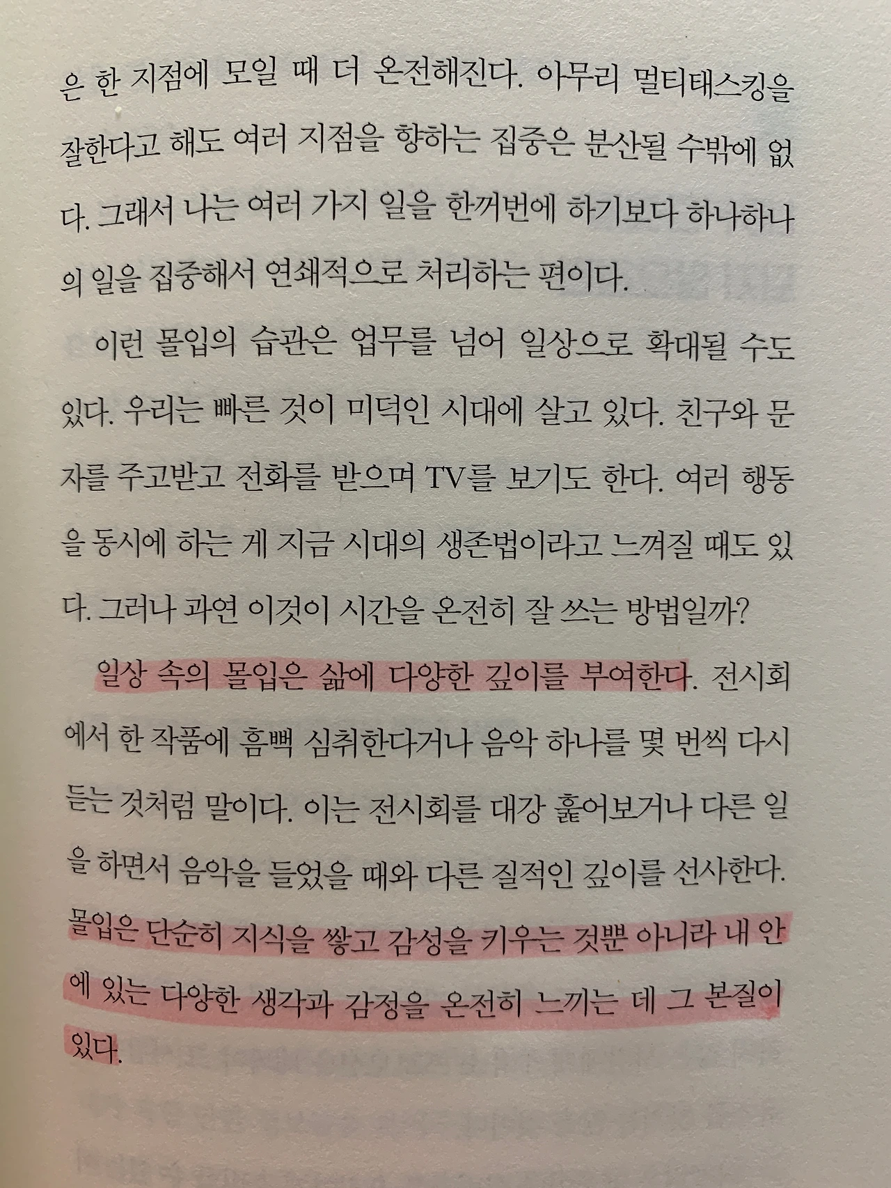 몰입은 단순히 지식을 쌓고 감성을 키우는 것뿐 아니라 내 안에 있는 다양한 생각과 감정을 온전히 느끼는 데 그 본질이 있다.