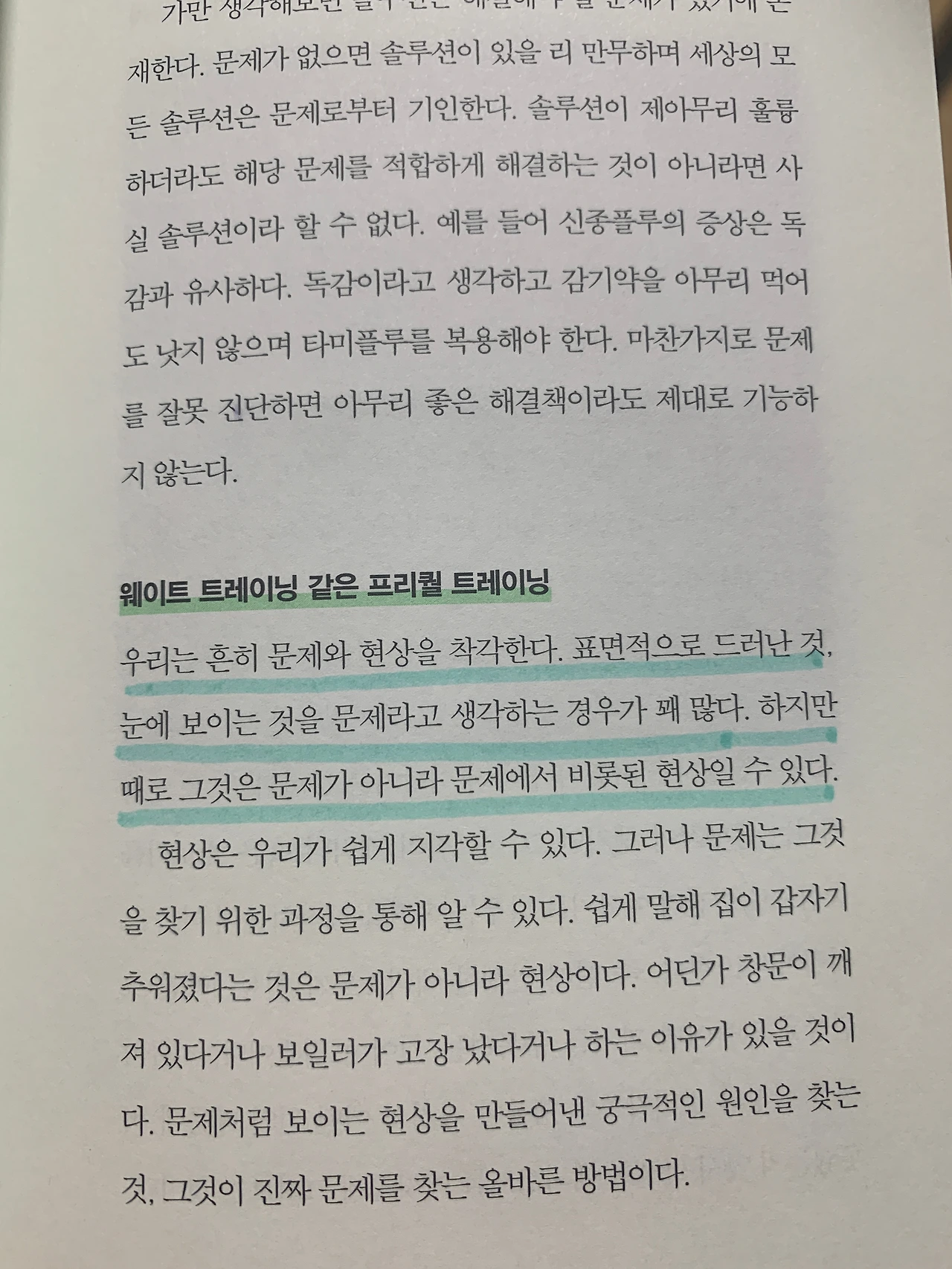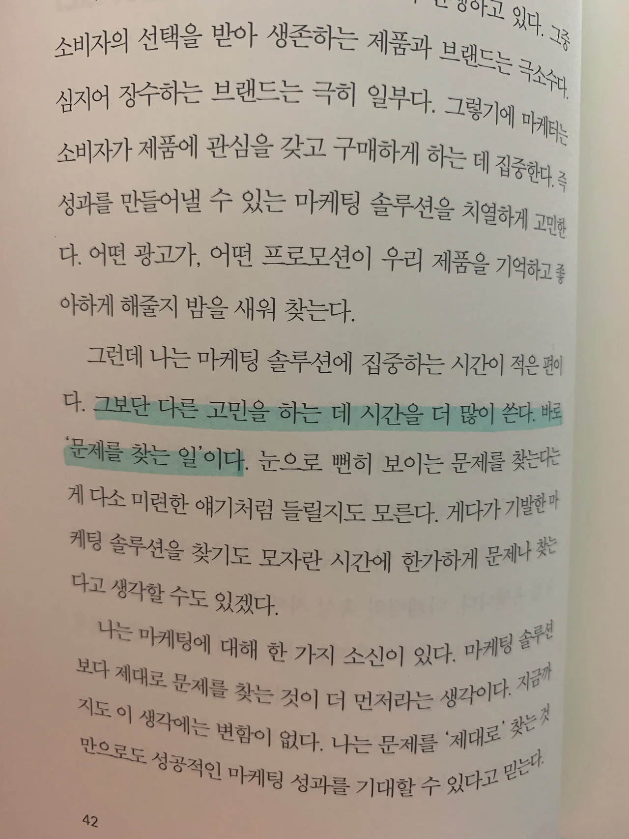 일을 하면서 많은 생각들을 하지만 정작 시간을 들이는 만큼 그만큼의 좋은 아이디어가 떠오를까? 하면, 그건 아니다. 이건 비단 마케터만의 이야기는 아닐 텐데, 저자는 이를 "문제를 찾는 일", "문제와 현상을 구분하는 방법" 등을 통해 조금 더 효율적으로 할 수 있을 것이라고 제시한다.