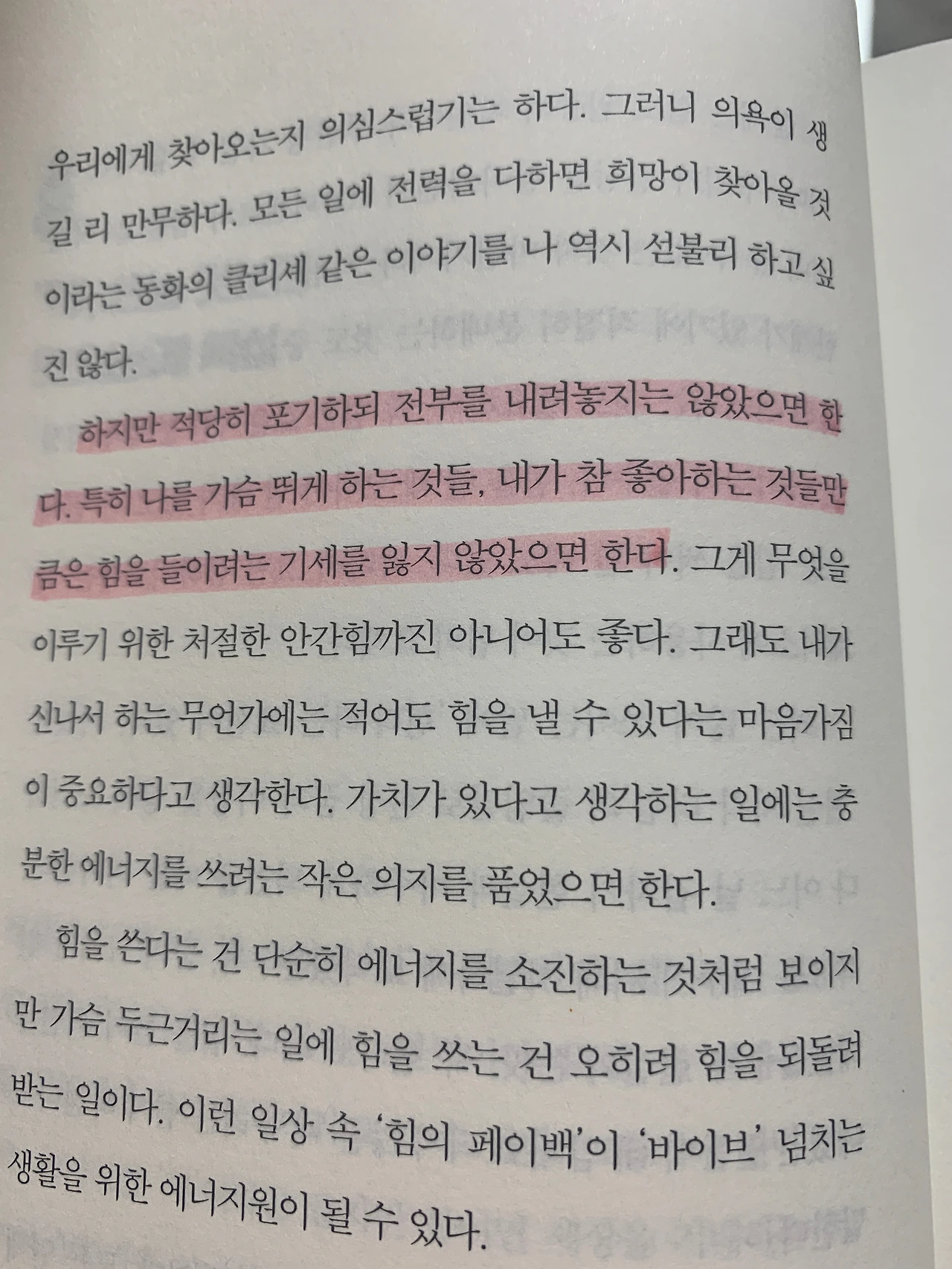 하지만 적당히 포기하되 전부를 내려놓지는 않았으면 한다. 특히 나를 가슴 뛰게 하는 것들, 내가 참 좋아하는 것들만큼은 힘을 들이려는 기세를 잃지 않았으면 한다.