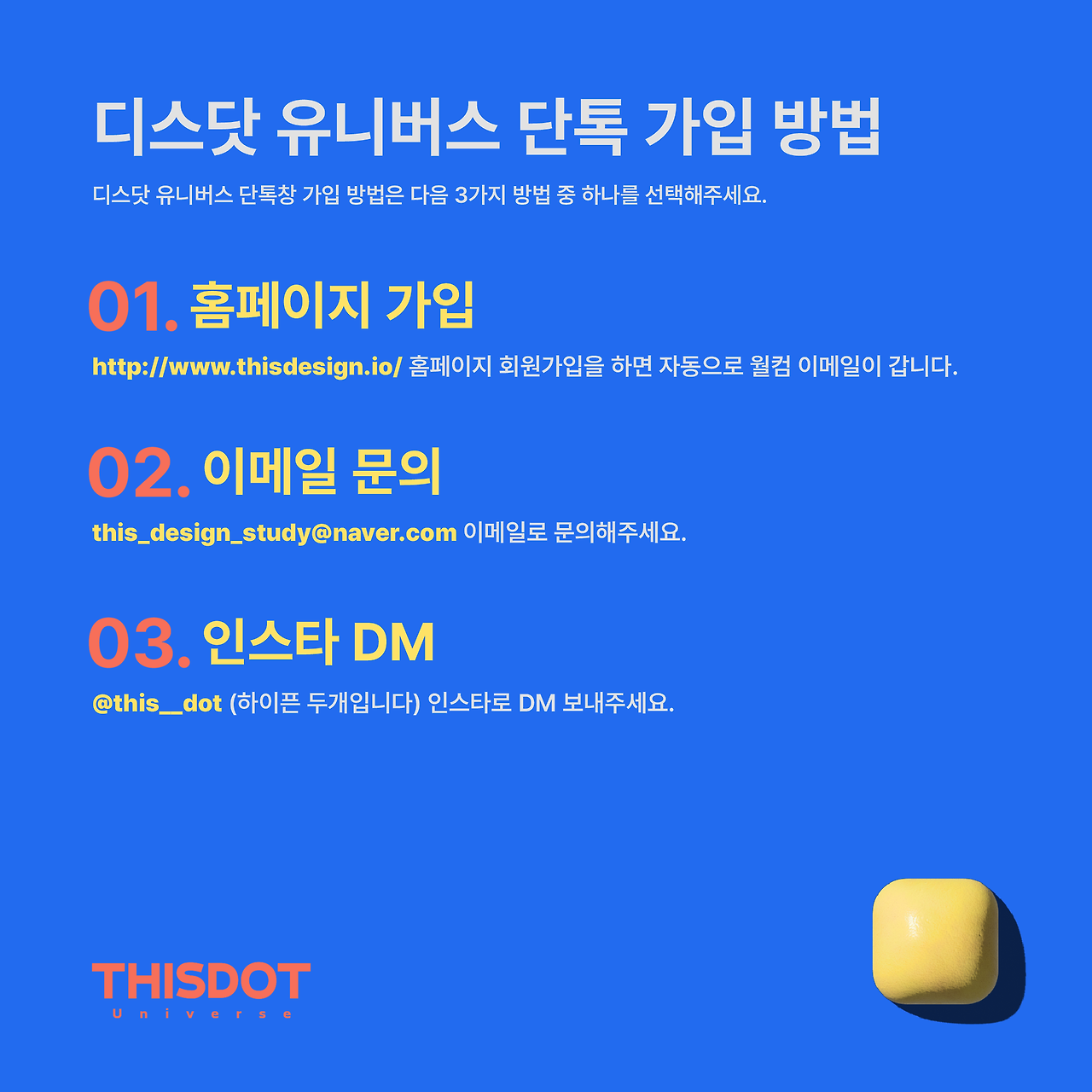 THISDOT은 단톡창에서 매일같이 다양한 사람들과 소통합니다. 단톡창 가입은 아래 링크로 신청하거나 이미지 참조 부탁드립니다.
