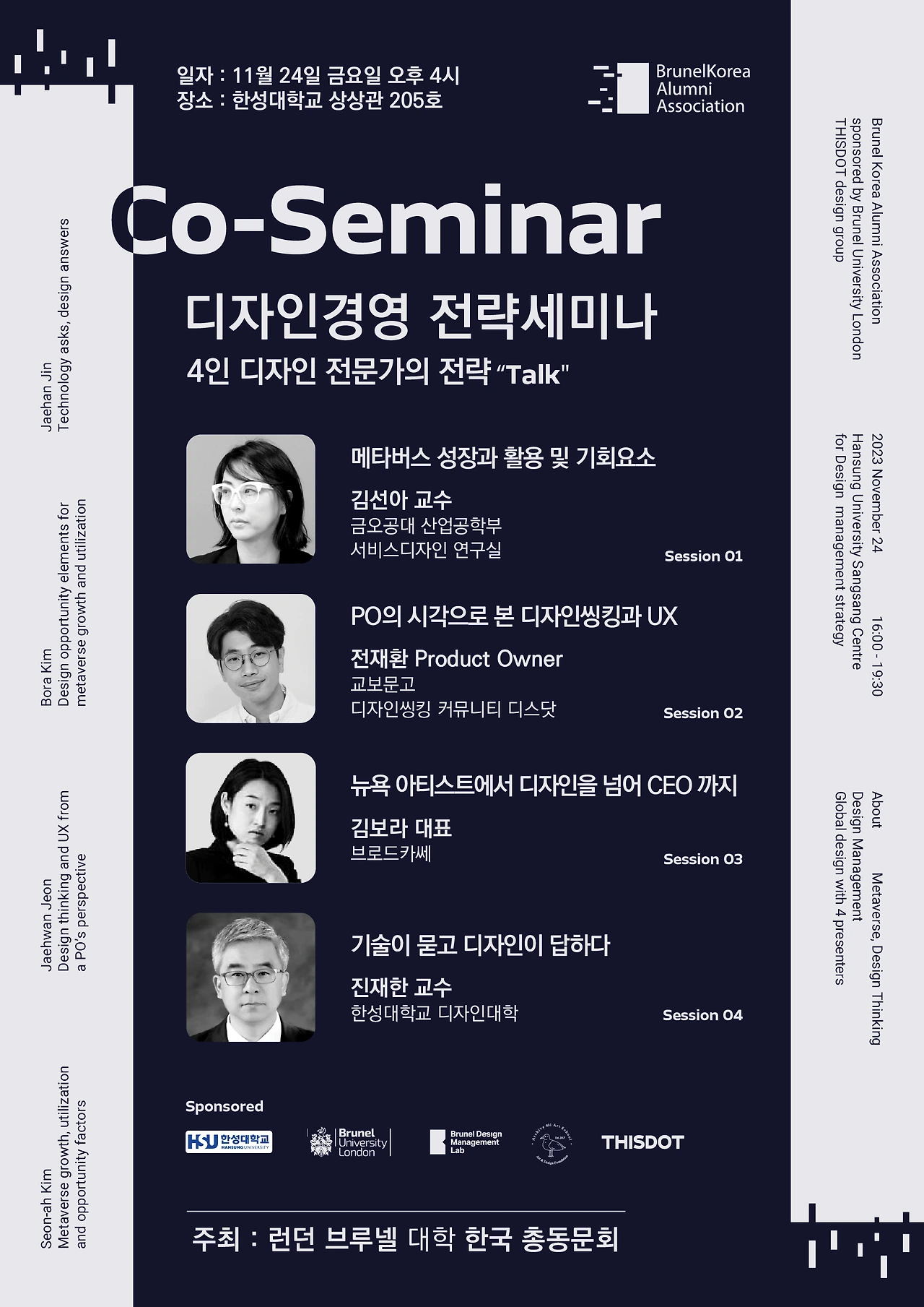 [세미나] 디자인경영전략세미나 지원서 - 4인 디자인 전문가의 전략 tallk 안녕하세요, 영국 런던 브루넬 대학교 한인 총동문회와 디자인씽킹 커뮤니티 디스닷의 공동 주최로 한성대학교에서 디자인 전략세미나를 개최합니다. 참가비는 무료이나 참석자 명단 확인을