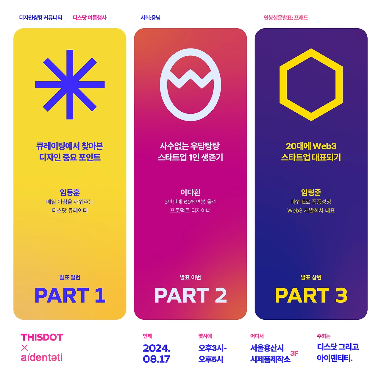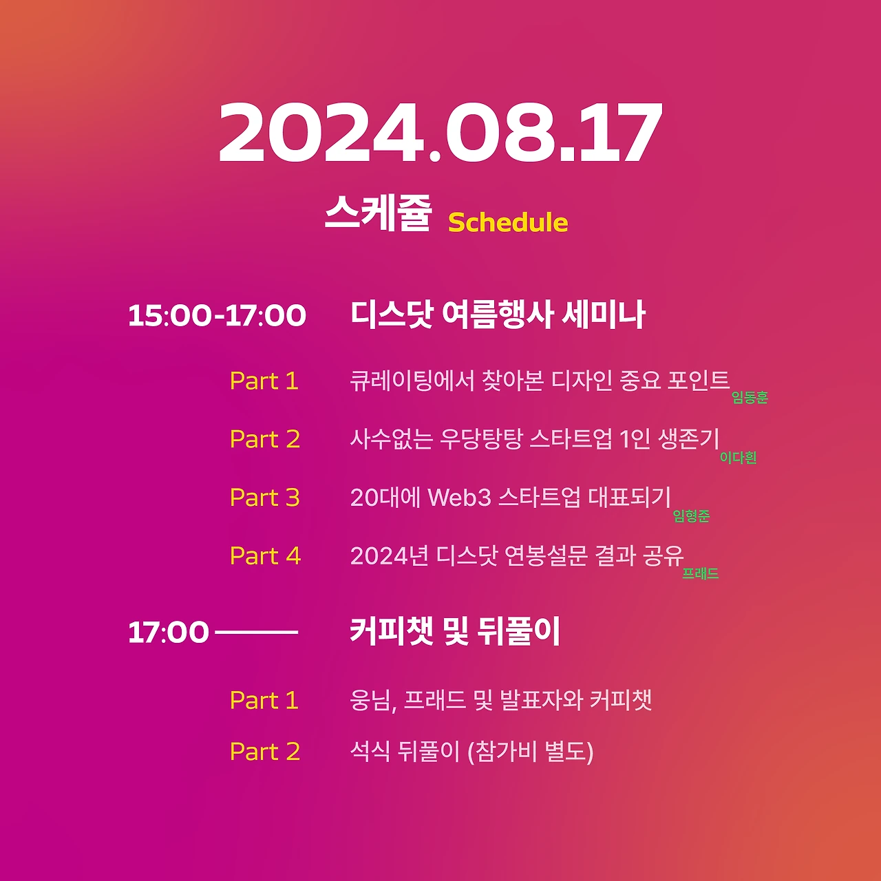 안녕하세요, 디자인커뮤니티 디스닷에서 2024년 여름행사를 진행합니다. 많은 참여 부탁드립니다.