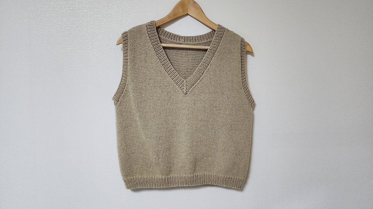 이게 내 첫 뜨개옷이다. 뜰 때는 코가 삐뚤빼뚤 했지만 세탁의 힘으로 가지런해졌다. 중고 거래로 샀던 실이라 정보는 없지만 까슬거리는 걸 봤을 땐 아크릴 함량이 높은 실인 것 같다. 게이지 내는 법도 몰랐고 사이즈를 어떻게 재야 하는지도 모른 채 무작정 유튜브만 따라 하다가 망했고, 다시 처음부터 시작했었다.