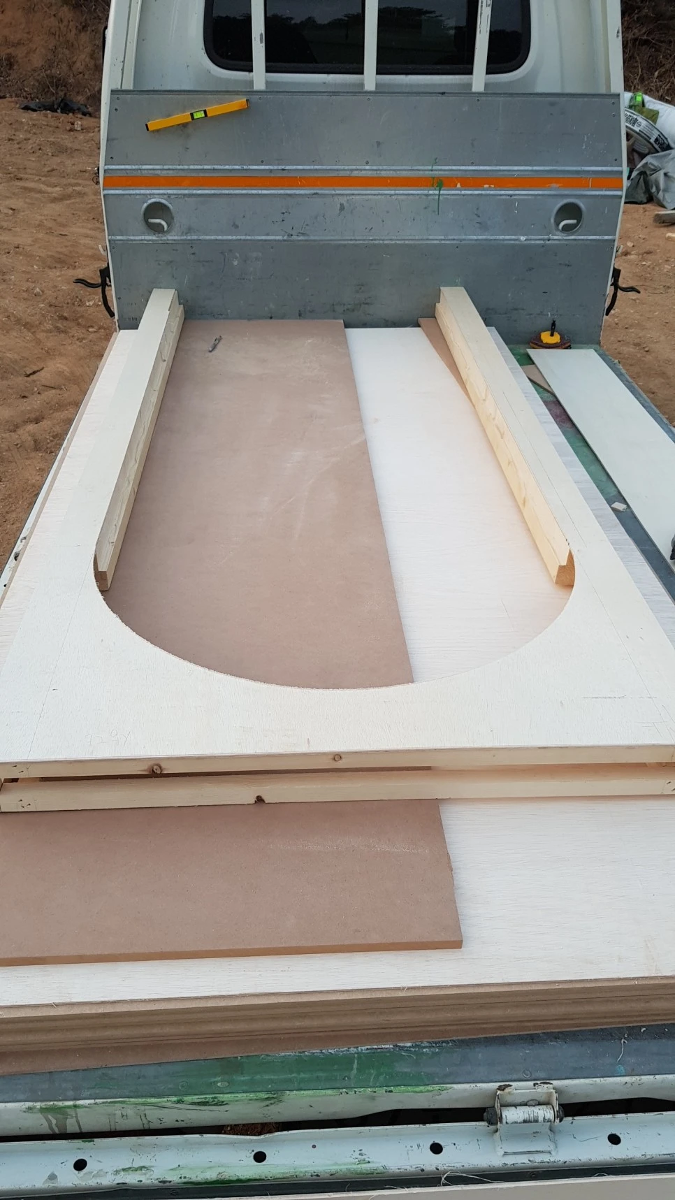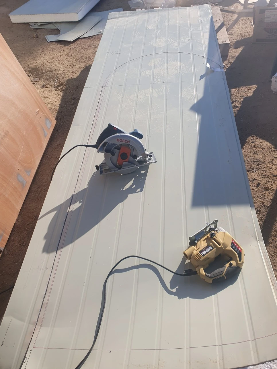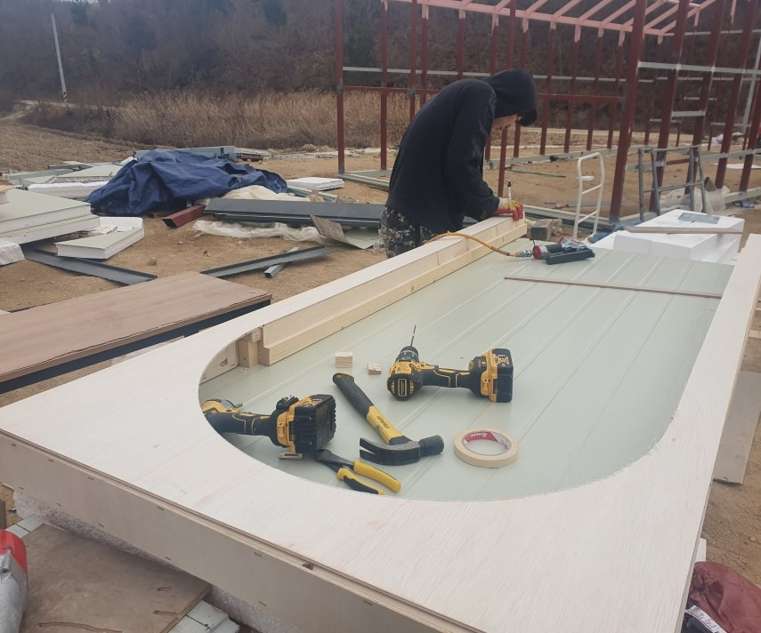 2) 판넬을 컷팅하여 아치를 딴다 : #원형톱 과 #직쏘 를 이용하여 철판을 오려내고 스티로폼 자르는 열선으로 곡선 부위를 잘라냄