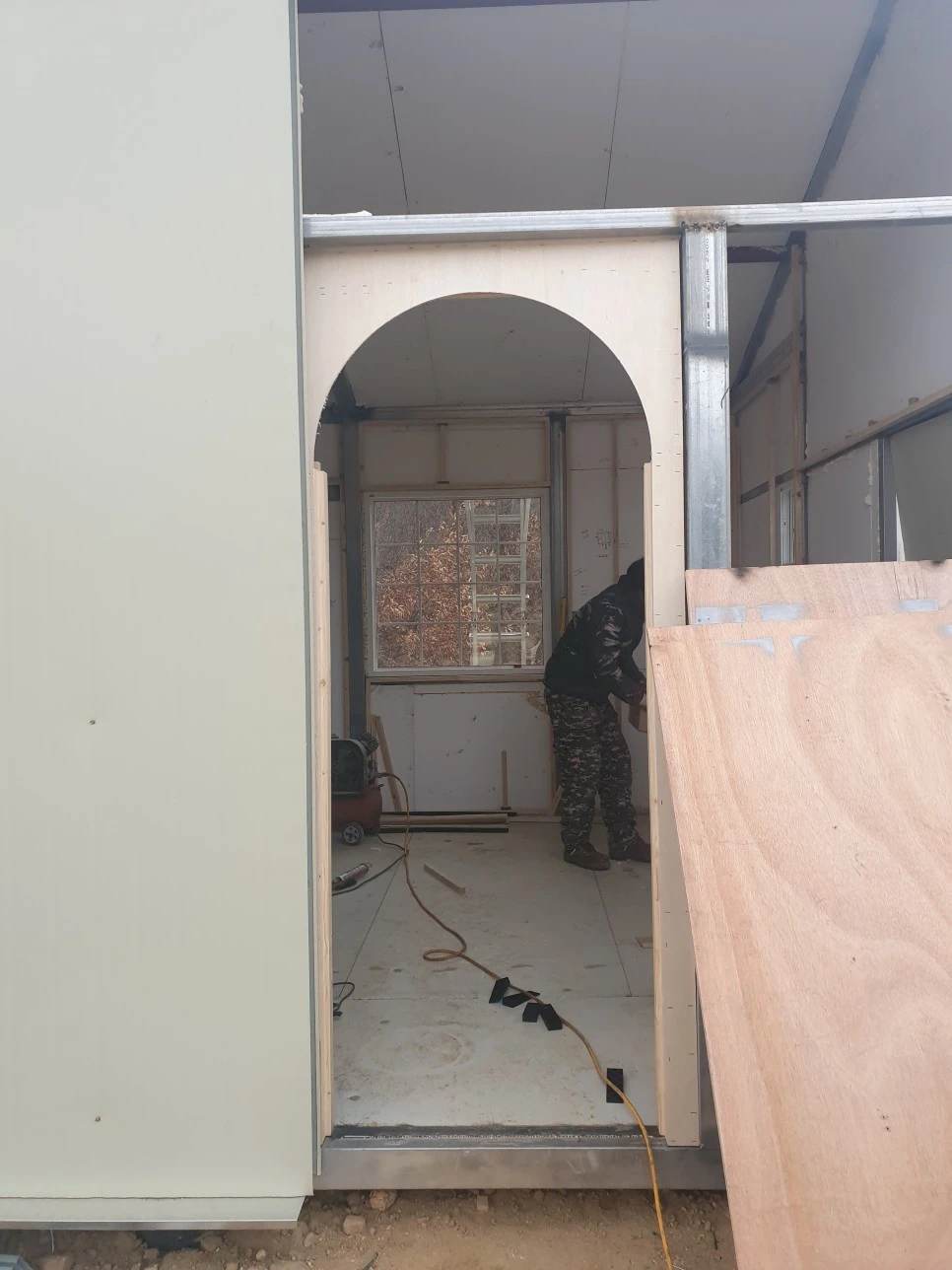 *아치를 만드는 방법 : 보통은 실내 목공에서 다루끼를 짧게 끊어 이어붙여 아치를 만들고, 그 위에 오징어 합판을 댄다.
