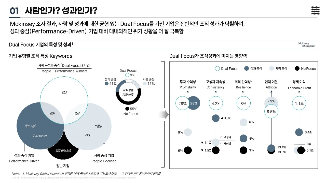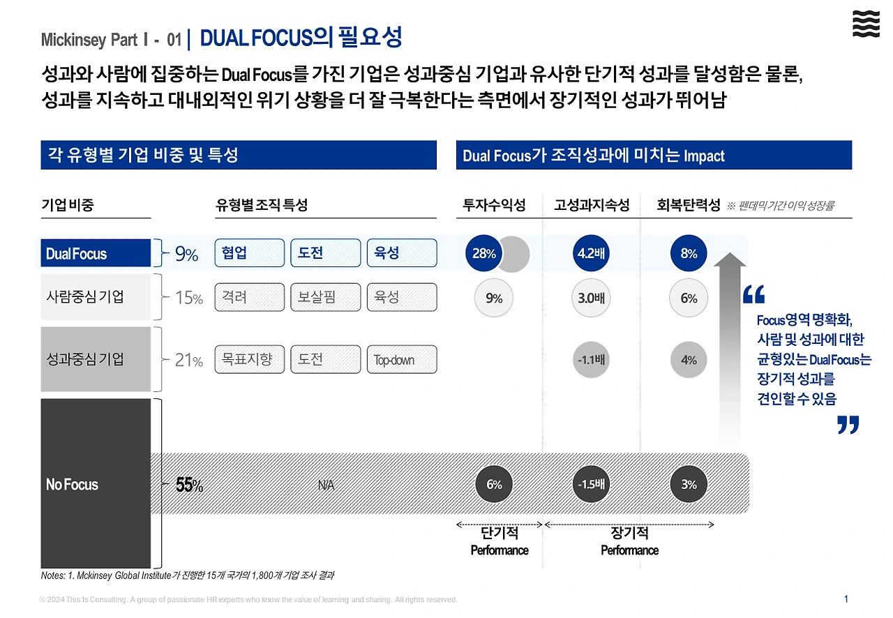 장기적인 성과(고성과 지속성 및 회목탄력성)를 고려할 때, 성과와 사람 모두에게 집중하는 Dual Focus가 필요합니다.