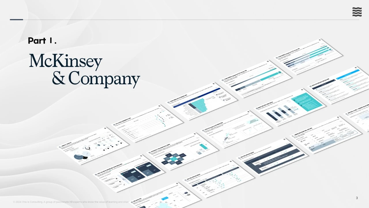 This Is Consulting의 첫 프로젝트는 흔히 글로벌 3대 컨설팅펌으로 불리는 MBB(McKinsey, Bain, BCG)로 시작합니다. 각 기관별로 10개씩, 총 30개의 Article을 PPT로 구성하였습니다.