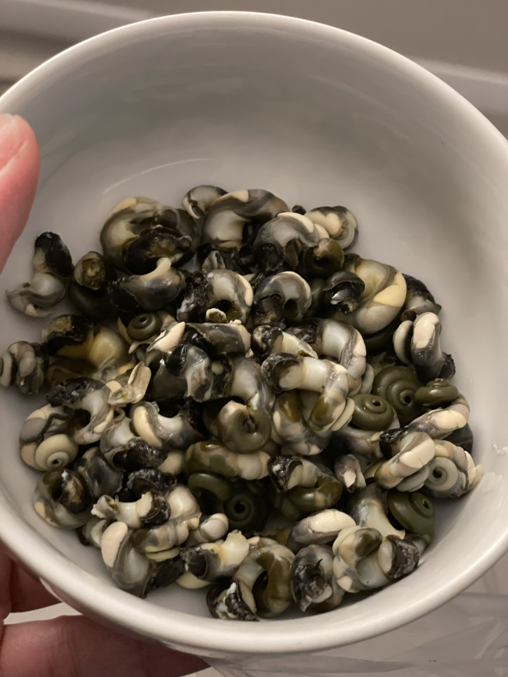 뒤늦게 따긴 했지만 나쁘지 않은 성과다. 집에 돌아오니 7시가 넘었고, 보말껍데기를 하나하나 솔로 씻고, 해감을 하니 12시가 다 돼버렸다. 보말죽을 끓일 때는 보말을 삶은 물을 같이 넣는다고 하니 깨끗하게 닦는 것이 좋다. 해감을 할 때는 바닷물과 비슷한 농도로 소금을 넣고 칼이나 숟가락 같은 철금속을 넣어서 하면 더 잘 된다고 한다. 검은 비닐봉지를 덮어두면 좋다고 하는데 없으니 사이즈가 딱 맞는 둥그런 접시로 어둡게 만들어 주었다. 2시간 즈음 지나서 보니 뱉어놓은 모래가 거의 없었다. 내가 뭘 잘못했나 싶어 친구와 얘기를 하다가 친구가 알려주길 조개처럼 뻘이나 모래 속에 있는 게 아니라 많이 뱉어내지 않는다고 했다. 바닷물과 비슷한 농도를 위해 물과 소금의 정확한 비율이 있겠지만 나는 그냥 휙휙 마음대로 넣은 터라 조금 싱겁긴 했다.
