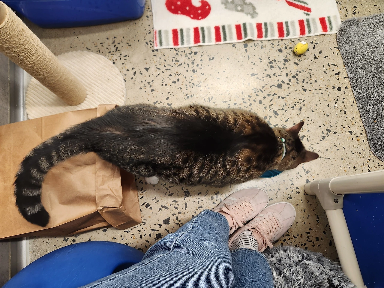 그러자 직원이 활짝 웃으면서 따라오라며 고양이들이 있는 곳으로 안내해 줬다. 이 보호소의 고양이들은 각기 다른 세 종류의 공간에서 머무는데, 흔히 떠올릴리는 닭장 스타일의 케이지(물론 닭장보단 훨씬 크다), 이동식 공중화장실 크기의 작은 방 한 칸, 그리고 사람이 함께 머물 수 있는 큰 방, 이렇게 세 곳에 나눠져 있다. 나는 아주 순한 고양이가 있는 작은 방으로 안내받았다. 들어가란다. 30분 동안 고양이한테 책 읽어주고 나와서 집에 가면 된단다.