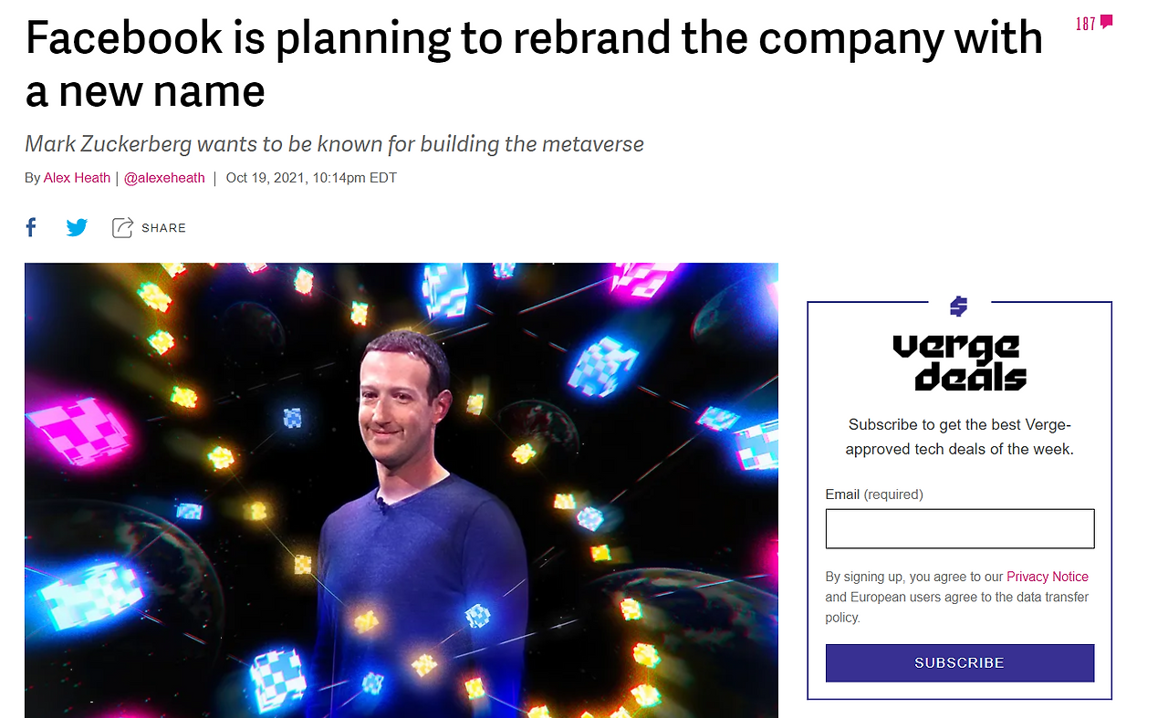 ■ 10.19 I 페이스북 CEO, 브랜드 명을 바꿀 것이라고 밝히는 티징 목적의 인터뷰 실시