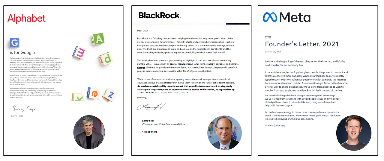 알파벳 지주회사 출범할 때 알파벳 공동 창업자 래리 페이지의 편지, 투자받으려면 ESG 준수하라고 파트너사 경영진에게 경고했던 블랙록 CEO 래리 핑크의 연례서한, 메타 론치 때 메타 CEO 마크의 편지 등은 다수 언론들에 자주 인용이 될 정도로, 임팩트 있게 잘 쓰였다고 보시면 됩니다.