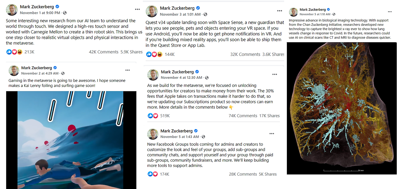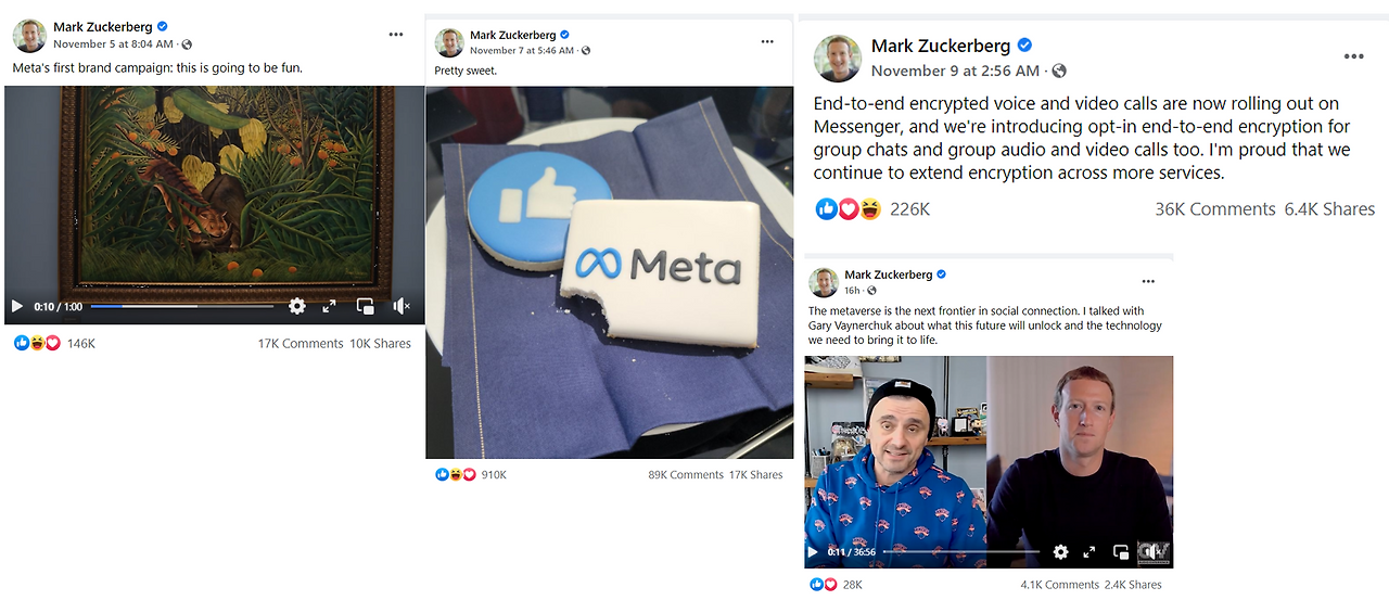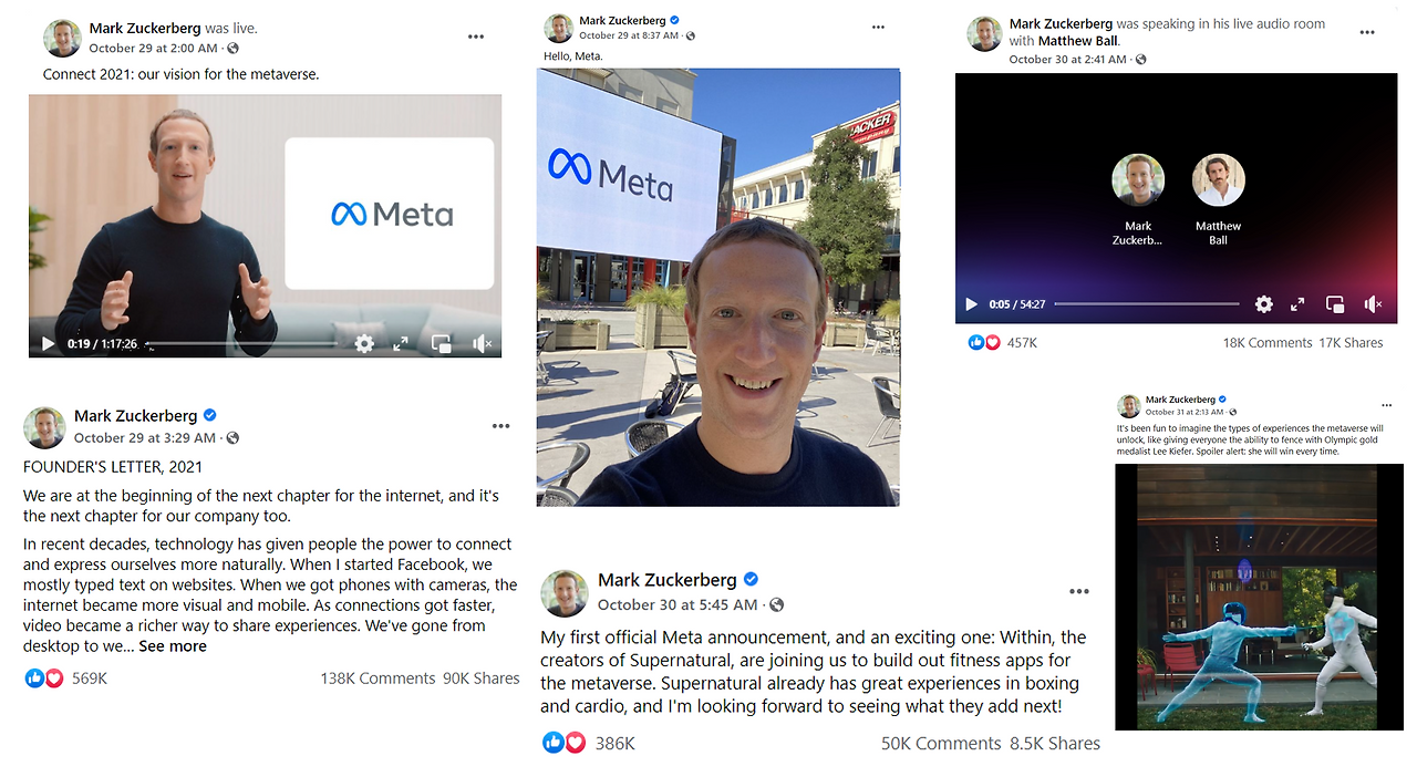일단 리브랜딩을 완료했으면, 리브랜딩이 가져올 편익에 대하여 정확하게 전달하는 커뮤니케이션이 필수입니다. 메타는 본사 차원에서의 글로벌 커뮤니케이션은 전략적으로 잘하고 있는 것 같습니다. 모든 것을 분석하기는 시간 관계 상 어려워, 가장 쉬우면서도, 가장 정확한 CEO의 디지털 커뮤니케이션 활동들을 타임라인 중심으로 공유합니다. 얼마나 전략적으로 설계해서, 커뮤니케이션하고 있는지 살펴보시기 바랍니다.