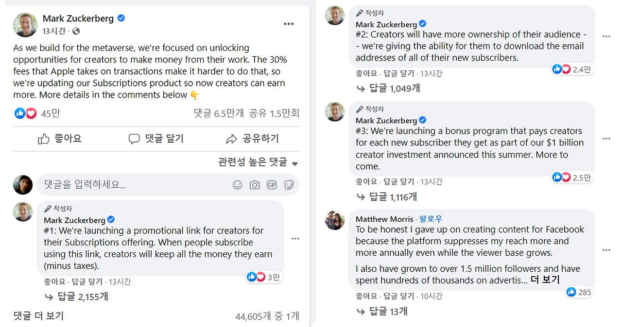 수익적인 측면에서의 유리함 이외에도, 크리에이터들이 자신의 구독자들에게 더욱 오너십(Ownership)을 갖도록 권한을 부여할 것이며, 100억 달러 크리에이터 투자 프로그램의 일부를 신규 구독자 증가 비율에 맞춰 보너스로 지급하는 지원 정책도 시행할 것이라 밝히고 있습니다. 메타 플랫폼에 더 다채로운 콘텐츠가 양산되도록, 개발자와 크리에이터들에게 적극적인 구애활동을 하고 있는 것입니다. 만약 이게 잘 먹힌다면, 양산될 콘텐츠가 증가될 것이니, 그만큼 메타에 힘을 실어줄 무기는 많지 않겠지요.