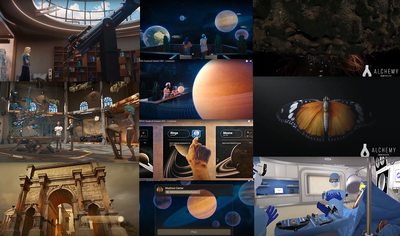 메타버스에서 역사, 과학, 의학, 생물 관련 학습이 가능합니다. 어려운 외과 수술 실습도 유명 교수가 바로 내 앞에서 수술하고 있는 것처럼 몰입감 있게 시뮬레이션되며, 우주에 대한 교육도 하늘에 행성들이 정말 떠 있는 것처럼 구현됩니다.
