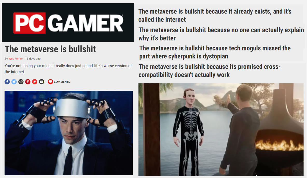 첫 번째 기업에 대한 불신이 왜 생겼는지에 대한 세부적인 원인은 <페이스북을 넘어서 메타버스로> 1편>을 참조해주시고, 두 번째 메타버스 산업에 대한 불신의 경우, PC게임 전문지 <PC Gamer>에서 발표된 <The Metaverse is bullshit>이란 기사를 참조하시면 이해하실 수 있습니다. 한 마디로, 메타버스는 말도 '헛소리, 난센스 한 거'라는 건데요. 그 근거로는 메타버스가 이미 인터넷 상에서 메타버스 게임 혹은 메타버스 플랫폼으로 이뤄지고 있다는 점과 새롭게 만들겠다고 하는 메타버스가 지금보다 어떤 점이 더 나은지 설명할 수 있는 사람은 아무도 없다는 점 등을 들고 있습니다. ※ 참고 : 기사 원문