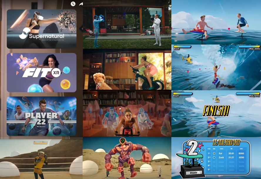 나는 실제현실에서는 거실에서 혼자 스피닝 자전거를 타고 있지만, 메타를 통하면, 강사와 다른 수강생들과 함께 단체로 스피닝 자전거를 타고 있습니다. 괴물 캐릭터 아바타와의 권투 경기나 유명 서퍼와의 서핑 경주도 합니다.