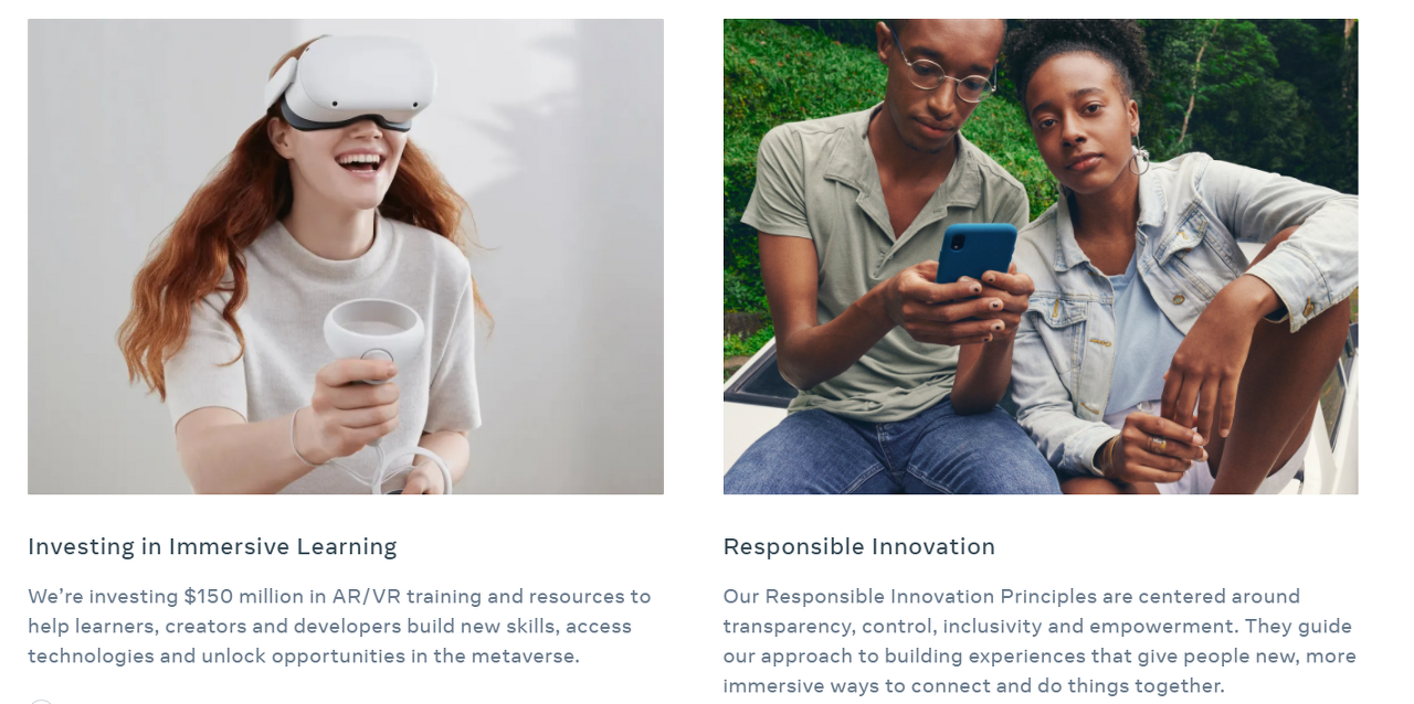 첫 번째 전략은 비전 제시입니다. 브랜드 명과 로고만 바꿔서는 안 됩니다. 왜 그런 이름으로 바꾸는지 이유가 반영된 비전이 제시되어야 합니다. 이때, 꼭 기억해야 할 점은 기업의 비전만이 아니라, 기업과 함께 할 "주주, 파트너, 고객 등 주요 이해관계자들 입장에서의 희망찬 미래를 제시"해주어야 한다는 점입니다. 이는 기업의 미션(Mission), 메니페스토(Manifesto)의 형식으로 구체화되기도 하는데요. 메타는 형식에는 구애받지 않은 듯, 아래처럼 자사 사이트에 명시하고 있습니다.