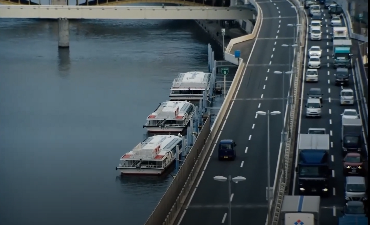 바로 이 장면이다. 왼쪽이 주인공의 자동차, 오른쪽은 바쁘게 살아가는 다른 사람들의 자동차다.