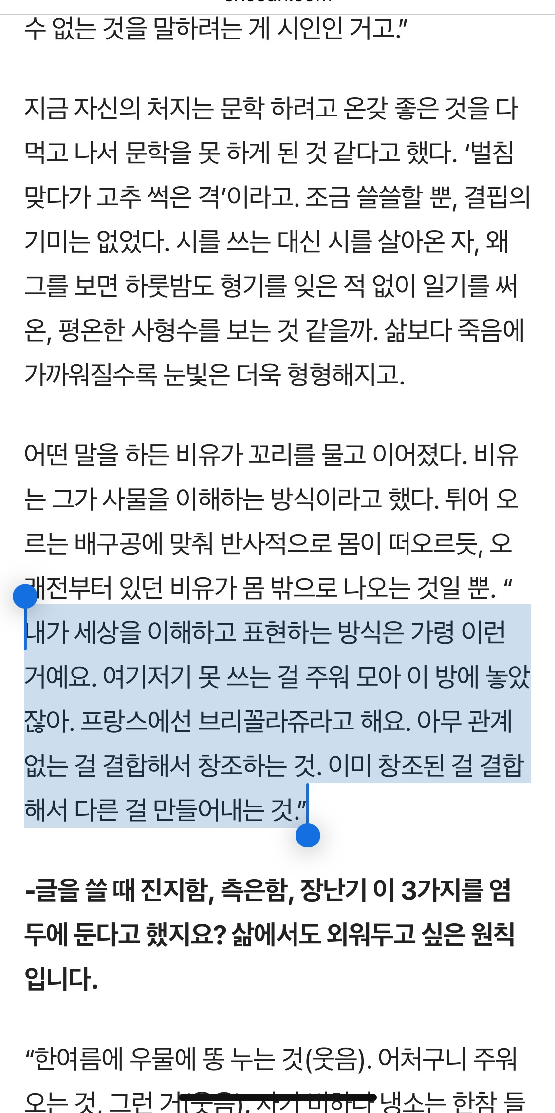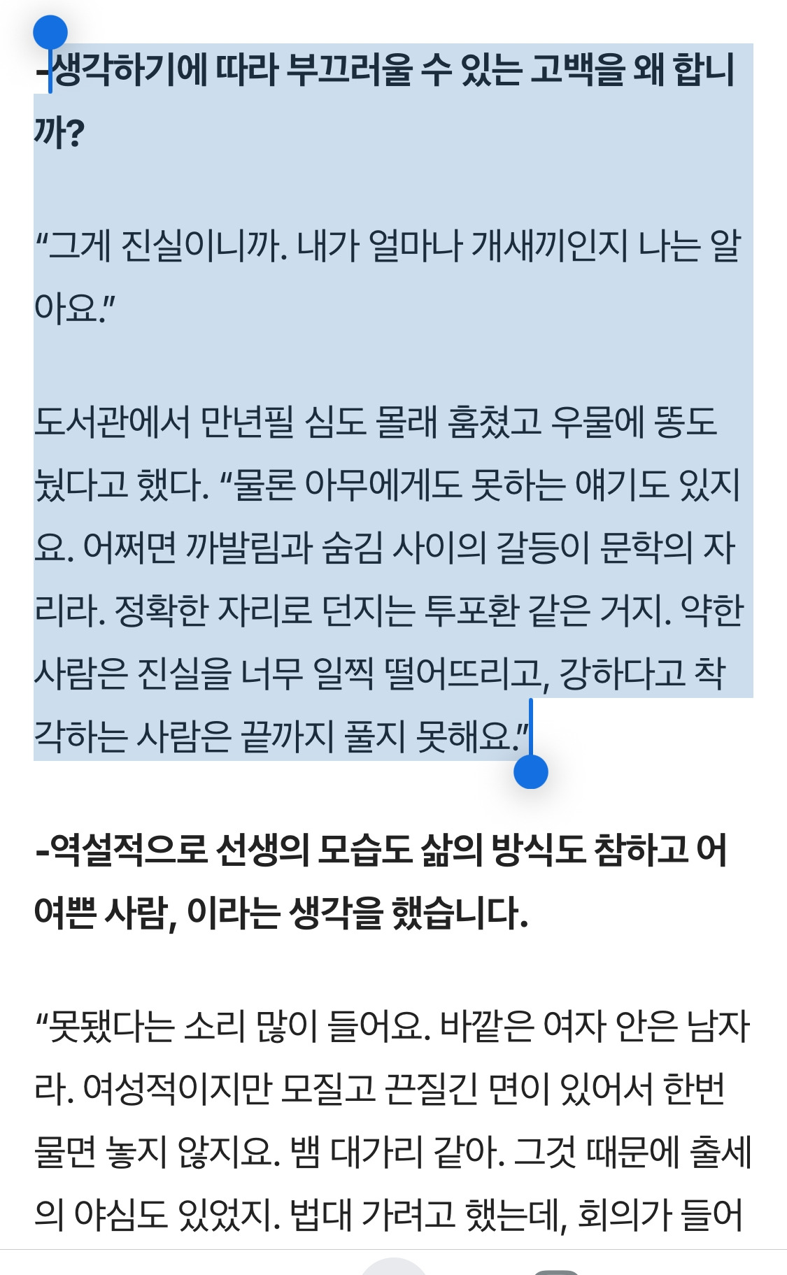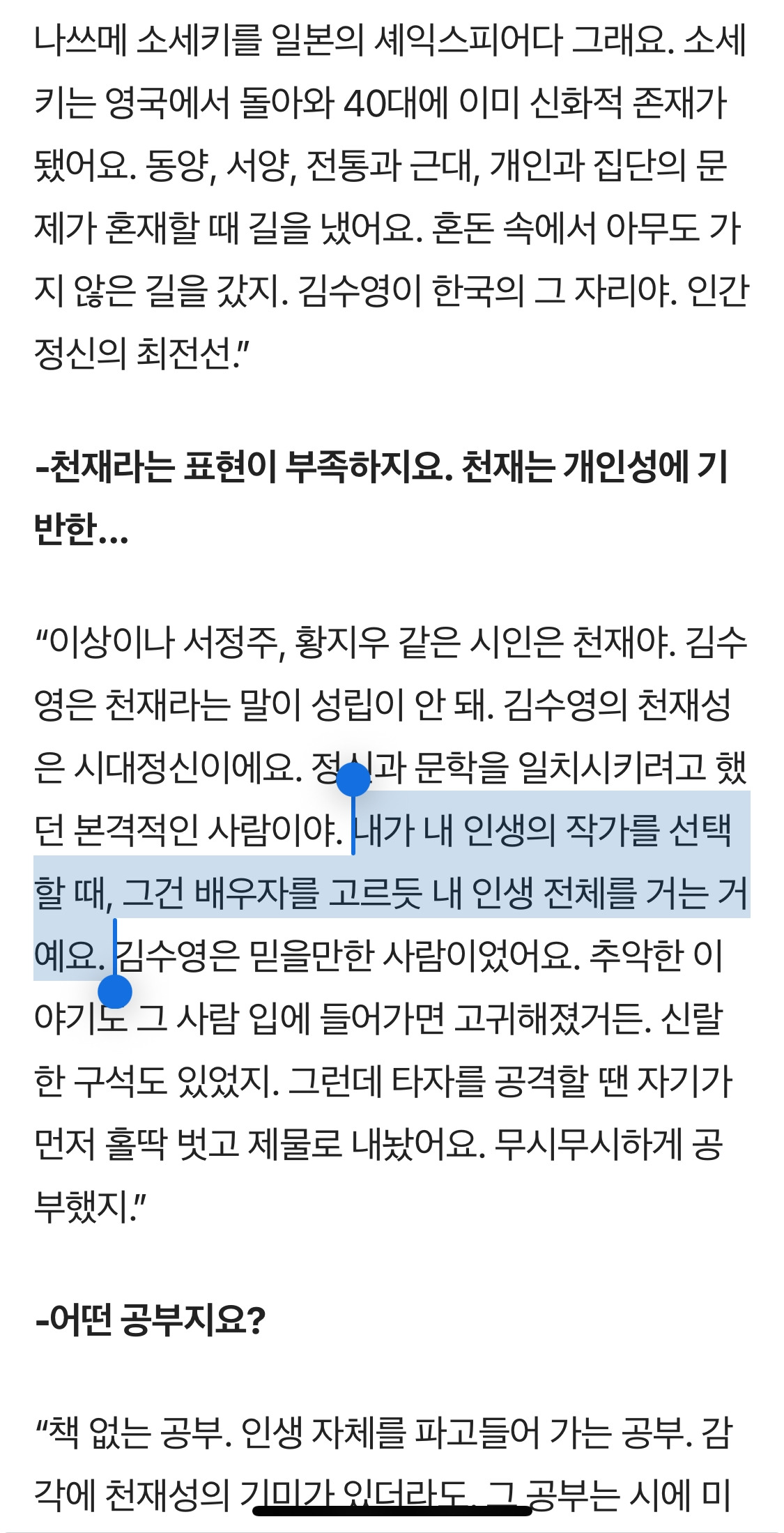 이성복 시인의 인터뷰... 진짜 너무 멋지다. 강한 사람은 갑옷을 잔뜩 껴입은 사람이 아니라, 맨몸으로 설 수 있는 사람이다. 자신의 맨얼굴을 직시하기 두려워 외면하는 이는, 또다시 다른 가면 속으로 빨려 들어간다.