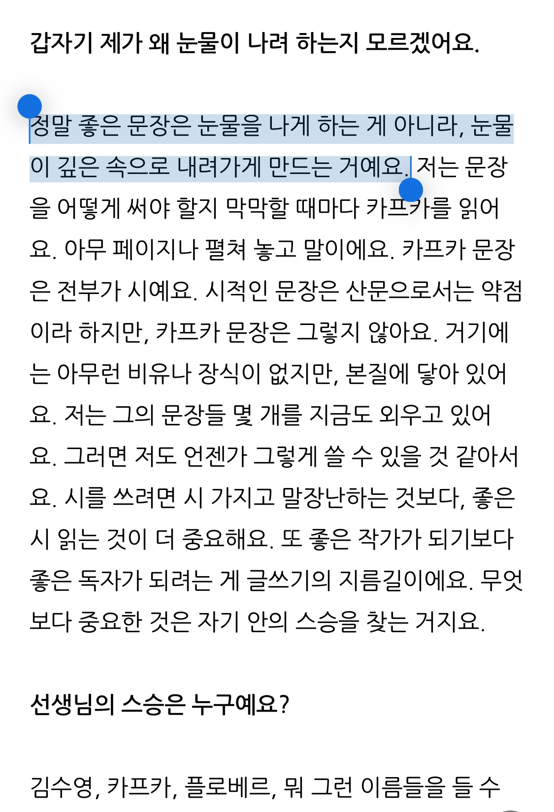 최근 시인들의 인터뷰와 함께 시를 읽어보고 있는데 정말 너무 좋다. 시를 어느정도 느낄 수 있게 되었다는 사실이 기뻤다. 위 강의 내용도 너무 좋았는데, 시를 읽다가 저 강의 내용이 생각나는 시의 구절을 발견했다.