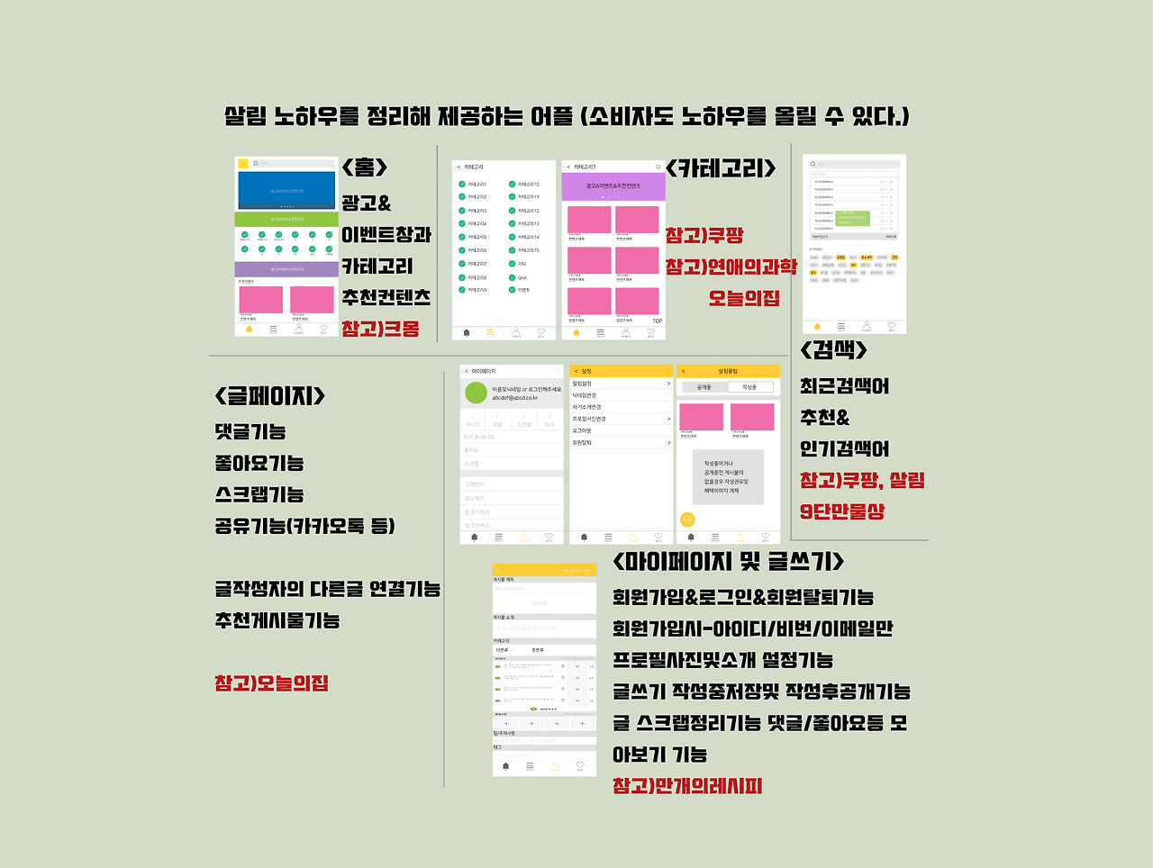 나만 필요하다고 생각하면 어쩌지? 체계란 없던 터라, 최소한의 근거는 마련하겠다고 이 서비스를 사용할 잠재고객은 누구일지를 찾아보았다. 나와 비슷한 1인 가구가 늘어나고 있다는 뉴스, 사회초년생과 신혼부부의 살림 관련 불편함을 호소하는 글을 수집했다.