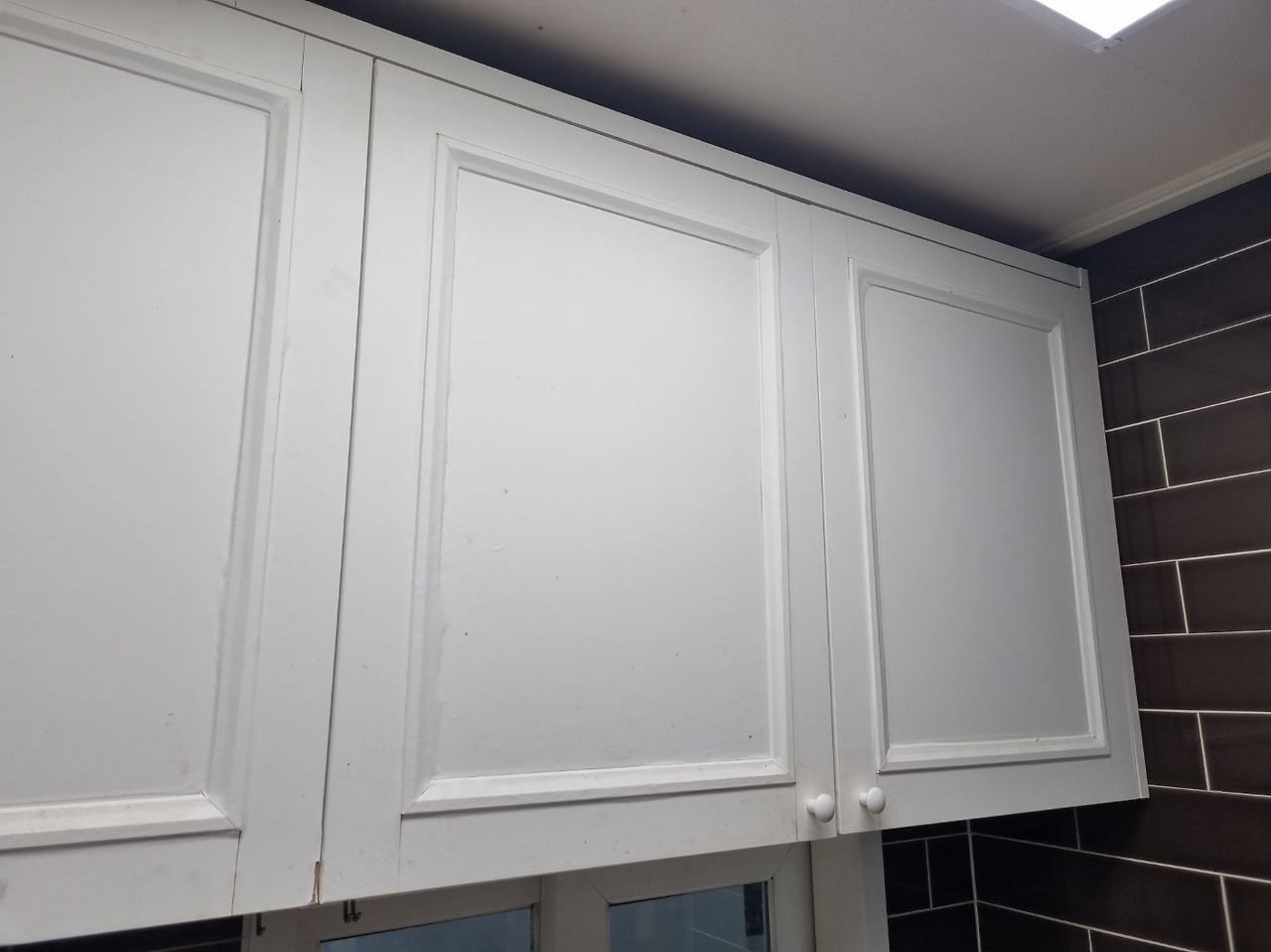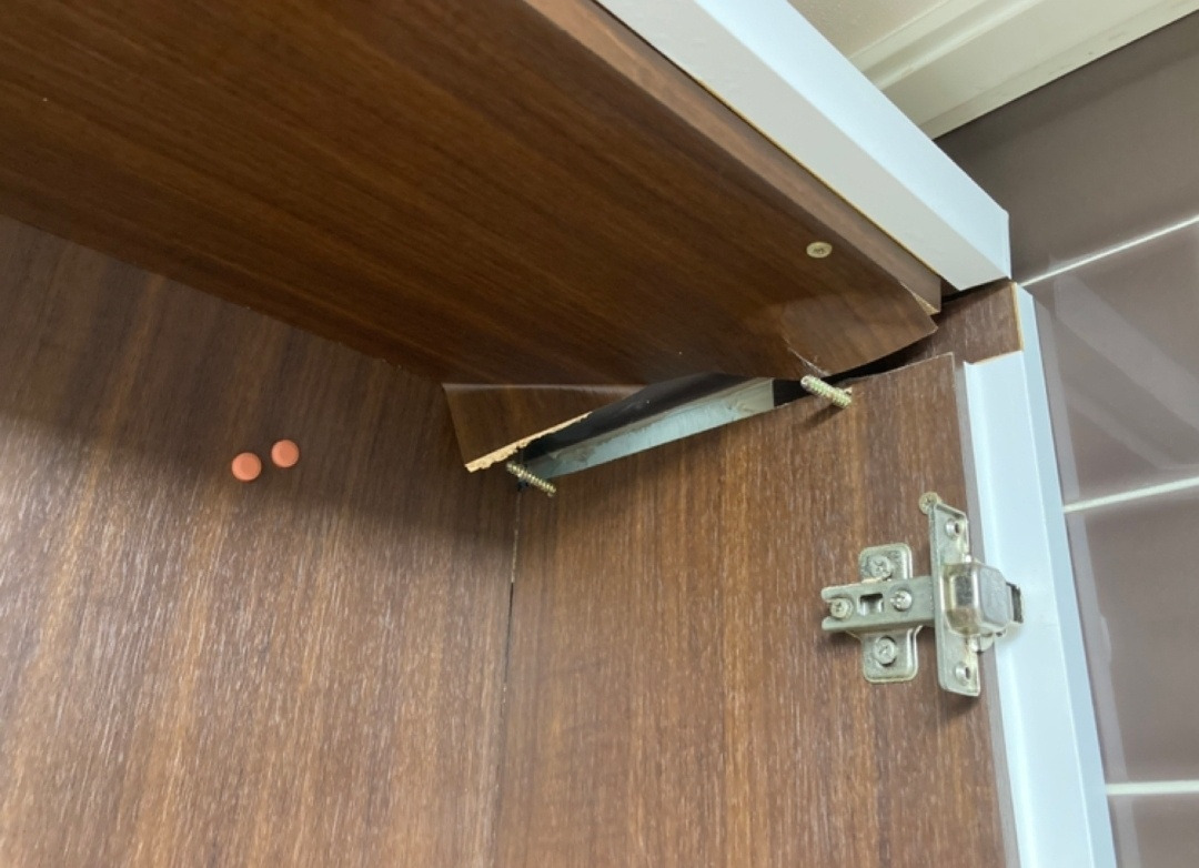 의뢰인은 싱크대 상부장 한쪽이 내려앉았다며 고맙게도 사진과 함께 보내왔다. 수리에 앞서 수리할 부위의 사진은 상태를 파악하고 견적을 내는 데 있어 매우 중요한 부분이다. 싱크대 한쪽이 내려앉았다고만 한다면 말 그대로 한쪽이 처진 것으로 생각할 수 있다. 문제가 있는 부위를 있는 그대로 사진으로 찍어 보내오면 상태를 파악하는 데 있어 매우 편리하다. 말만 듣고 처진 싱크대를 다시 원상 복구하면 되겠지! 했다가는 낭패를 볼 수 있기 때문다. 사진 속 싱크대는 상판과 하판이 아래로 처지면서 옆판과 결속해 주는 나사못을 뜯고 아래로 처져 있어 언제 떨어질지 위태위태해 보였다.