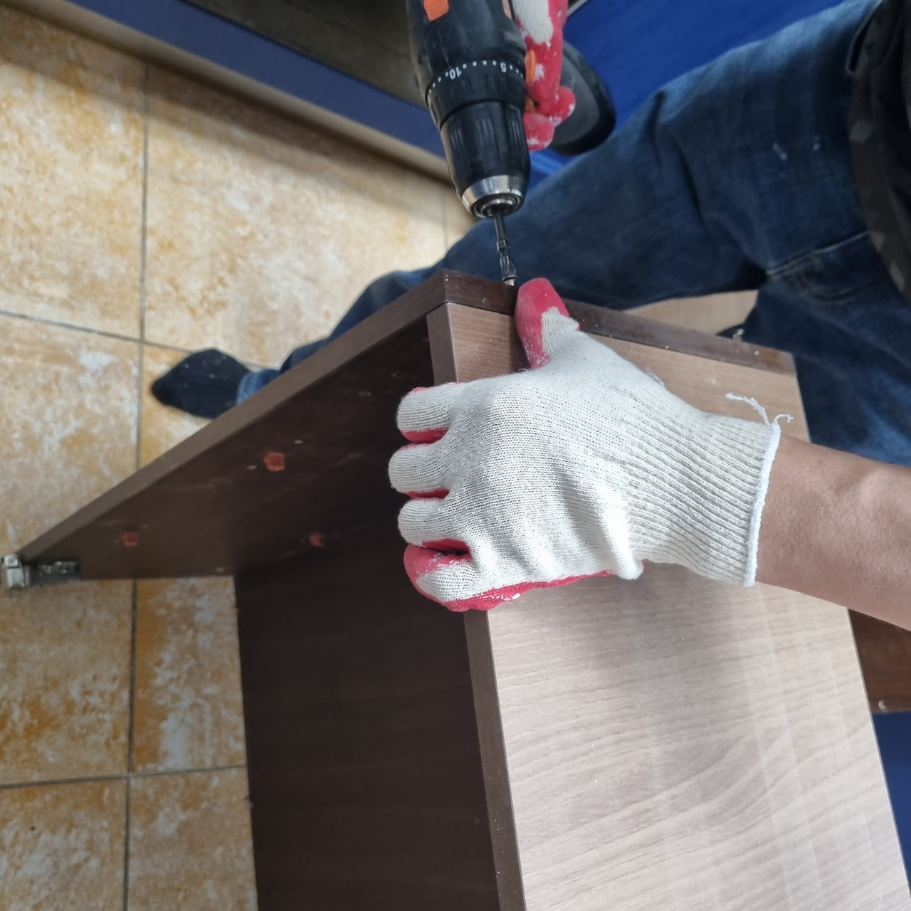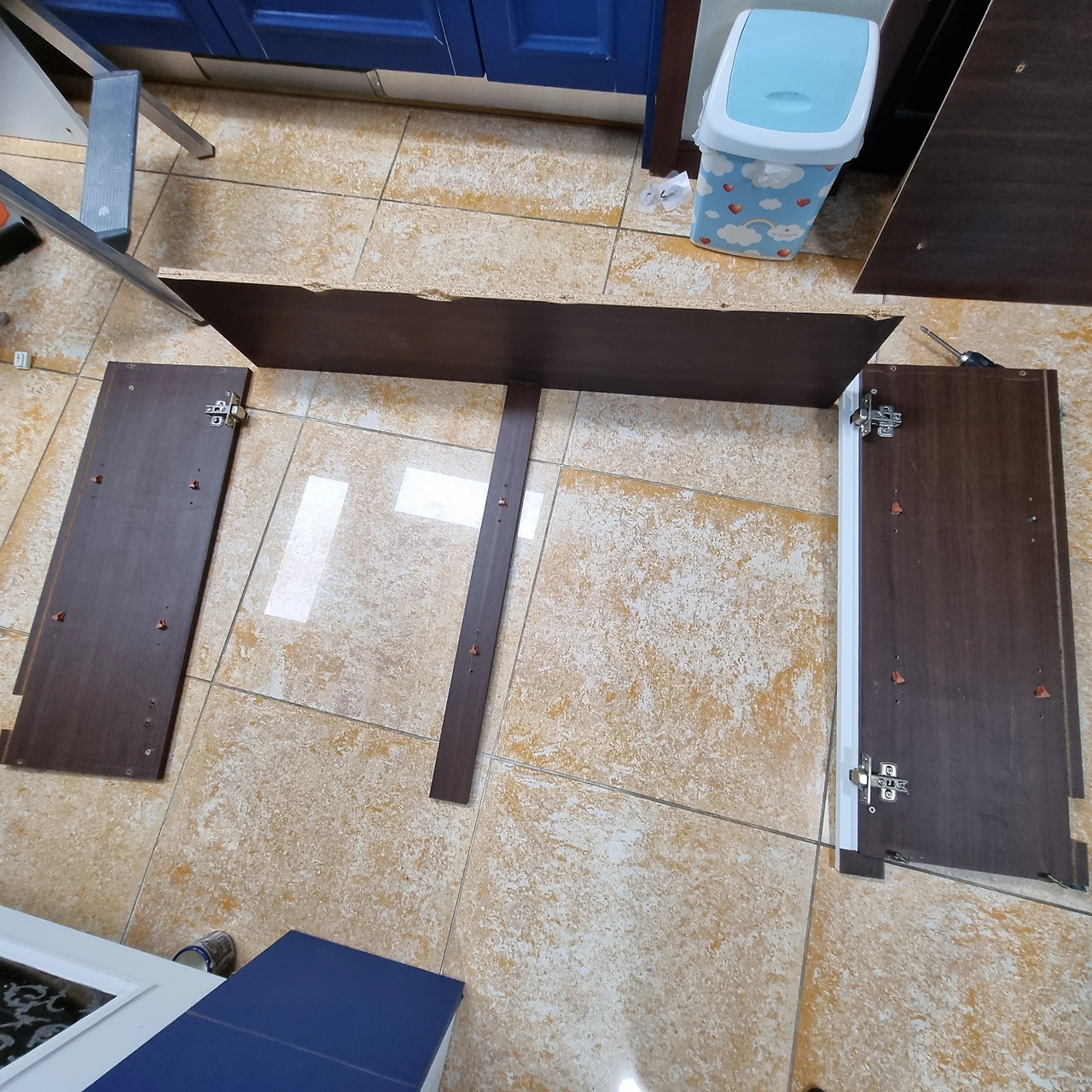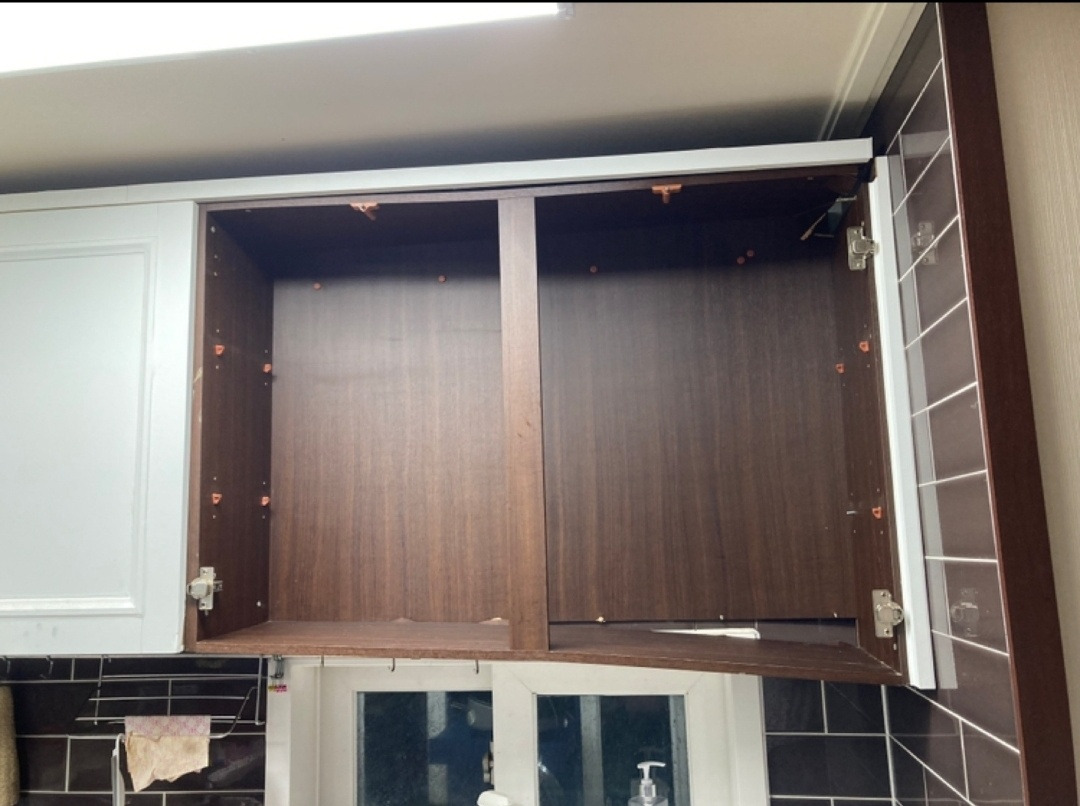 의뢰인의 집에 방문하여 남편분을 만났다. 싱크대의 상태를 살펴보니 실물은 상태가 더 좋지 않았다. 신속하게 싱크대 상부장을 분해해서 내려놓았다. 파손된 상하판재를 챙기고 나머지 나사못 등의 부속을 비닐봉투에 담아 분실되지 않도록 조치했다.