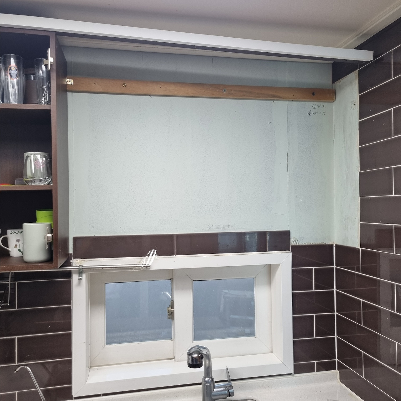 싱크대 상부장은 뒤쪽에 상부장을 걸 수 있도록 먼저 지지목을 설치한다. 설치된 지지목이 튼튼해야 오래오래 변형 없이 상부장이 걸려있는다. 이번 경우는 상부장에 무거운 물건을 수납했는지 상부장이 파손된 것이다. 상부장이 파손될 정도면 지지목을 점검해 봐야 한다. 아니나 다를까 지지목이 흔들리고 있었다. 지지목을 다시 튼튼하게 고정하고 나머지 상부장이 떨어지지 않도록 걸쇠를 걸어 고정을 했다.