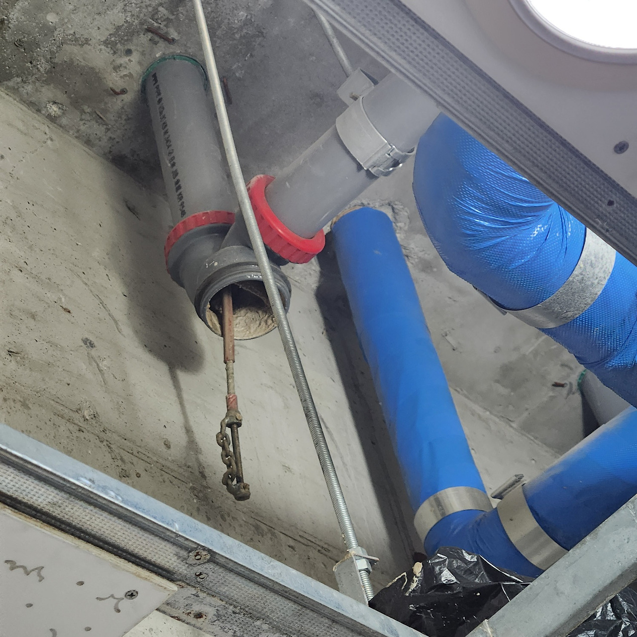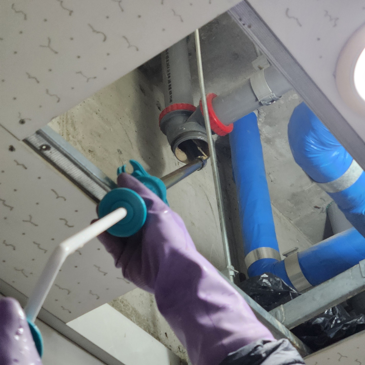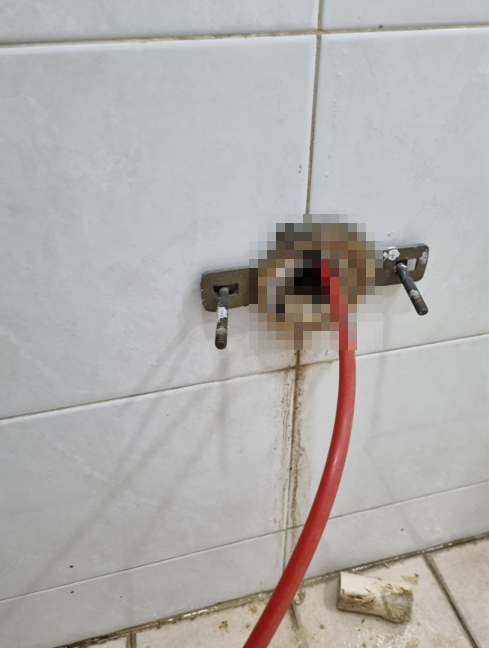 먼저 아래층에 내려가 사다리를 놓고 올라가 천장의 텍스를 풀어내고 오수관을 열었다. 오수관캡에 쌓여있던 요석과 함께 소변이 쏟아져 나왔다. 그런데 의외로 요석이 많이 퇴적되어 있지 않았다. 오수관은 천장에서 벽면으로 한번 꺾여 올라갔다가 다시 외부로 노출된다. 마치 'ㄷ'자 모양으로 되어 있다고 보면 될 것이다. 위층으로 올라가 소변기를 벽면에서 떼어내고 오수관 안쪽을 살펴보았더니 막힌 배관에 오수가 내려가지 못하고 가득 차 있었다. 관통기를 넣어보았더니 단단한 무언가가 꽉 막고 있었다. 원래대로라면 요석은 회전하는 관통기의 와이어 끝에 달린 돌기에 파쇄되며 뚫리기 시작해야 하는데 말이다.