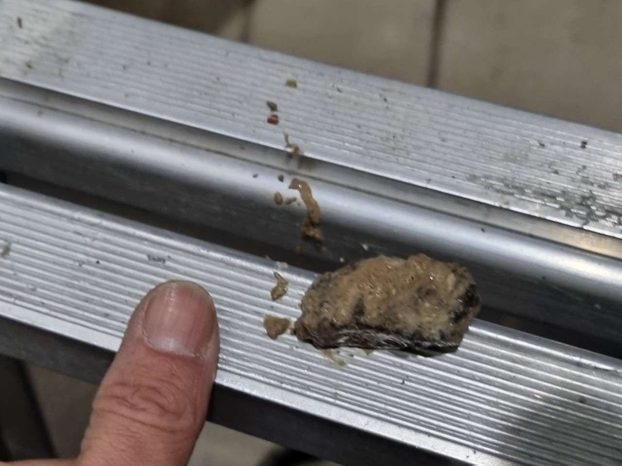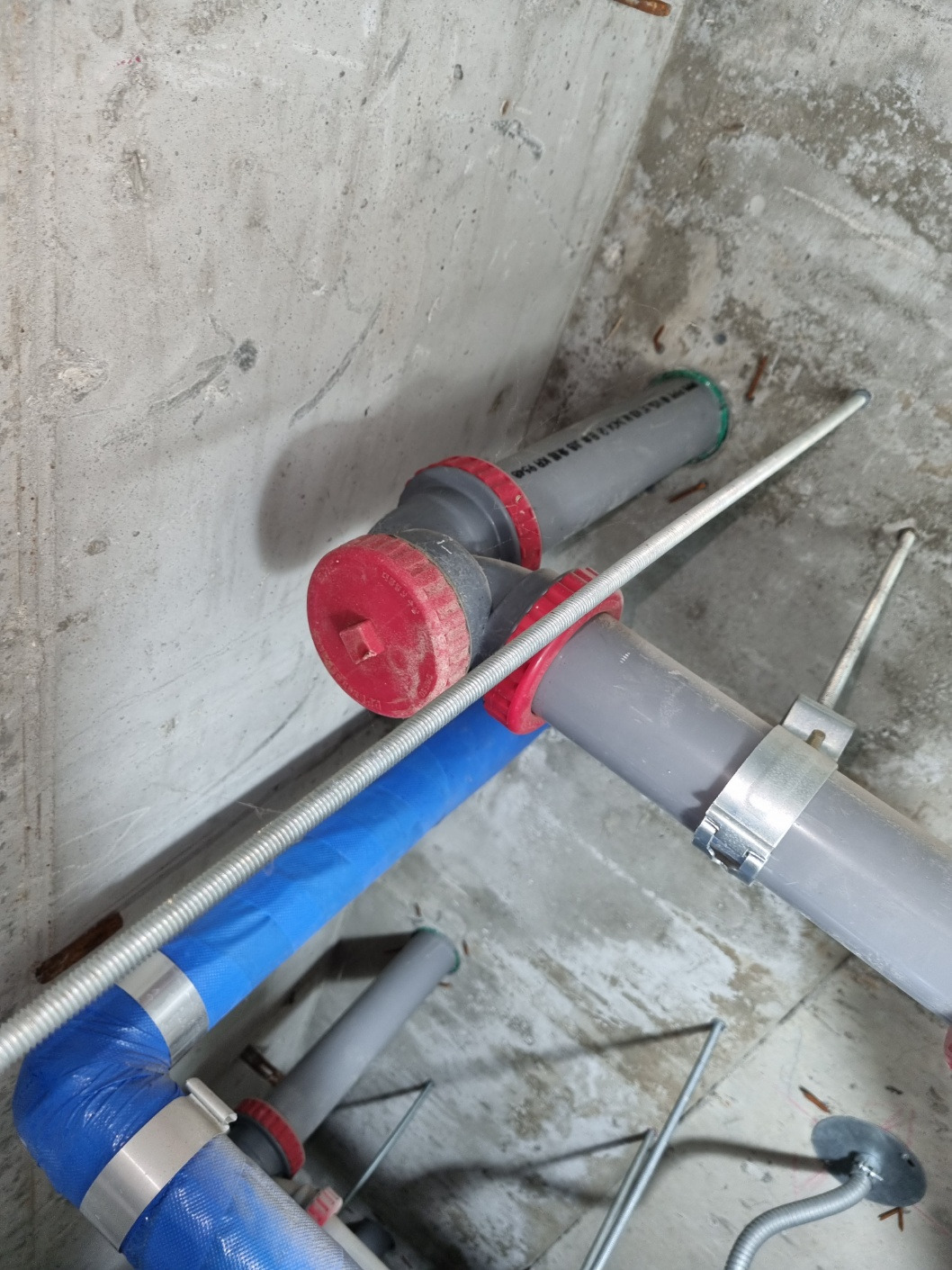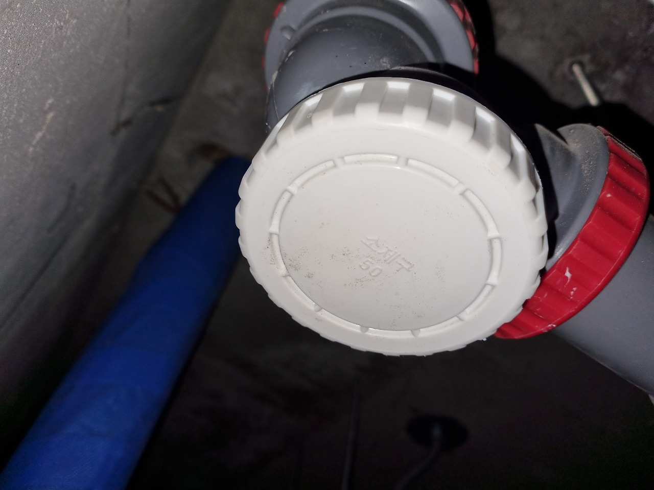 먼저 아래층에 내려가 사다리를 놓고 올라가 천장의 텍스를 풀어내고 오수관을 열었다. 오수관캡에 쌓여있던 요석과 함께 소변이 쏟아져 나왔다. 그런데 의외로 요석이 많이 퇴적되어 있지 않았다. 오수관은 천장에서 벽면으로 한번 꺾여 올라갔다가 다시 외부로 노출된다. 마치 'ㄷ'자 모양으로 되어 있다고 보면 될 것이다. 위층으로 올라가 소변기를 벽면에서 떼어내고 오수관 안쪽을 살펴보았더니 막힌 배관에 오수가 내려가지 못하고 가득 차 있었다. 관통기를 넣어보았더니 단단한 무언가가 꽉 막고 있었다. 원래대로라면 요석은 회전하는 관통기의 와이어 끝에 달린 돌기에 파쇄되며 뚫리기 시작해야 하는데 말이다.