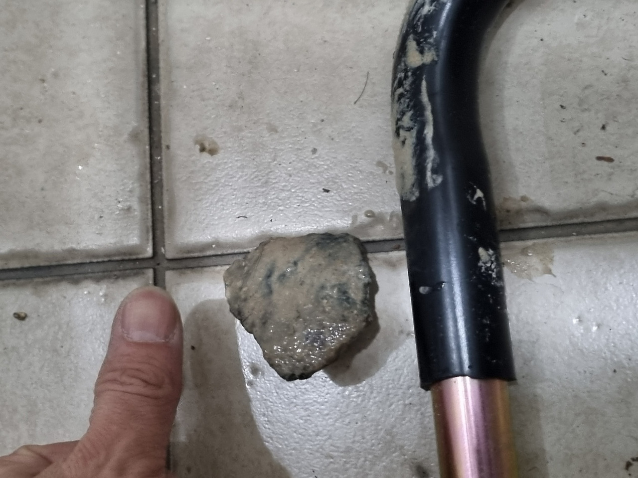 위층으로 올라가 관통기를 오수관에 넣고 돌리니 시원하게 내려가기 시작했다. 그 순간 아래층에서 무엇인가 '따닥'하며 떨어지는 소리가 들렸다. 급히 뛰어 내려가 살펴보니 요석의 잔여물들과 함께 시커먼 덩어리들이 떨어져 있었다. 그것들의 정체는 상상도 하지 못했던 커다란 자갈들이었다. 설마 하니 학원생들이 소변기에 넣었을까! 싶어 소변기와 오수관을 연결하는 파이프에 넣어보니 통과되질 않았다. 이 돌멩이는 소변기를 달기 전 오수관 안에 넣기 전에는 들어갈 수 없는 크기였다. 아내가 돌멩이 크기를 보더니 깜짝 놀란다.