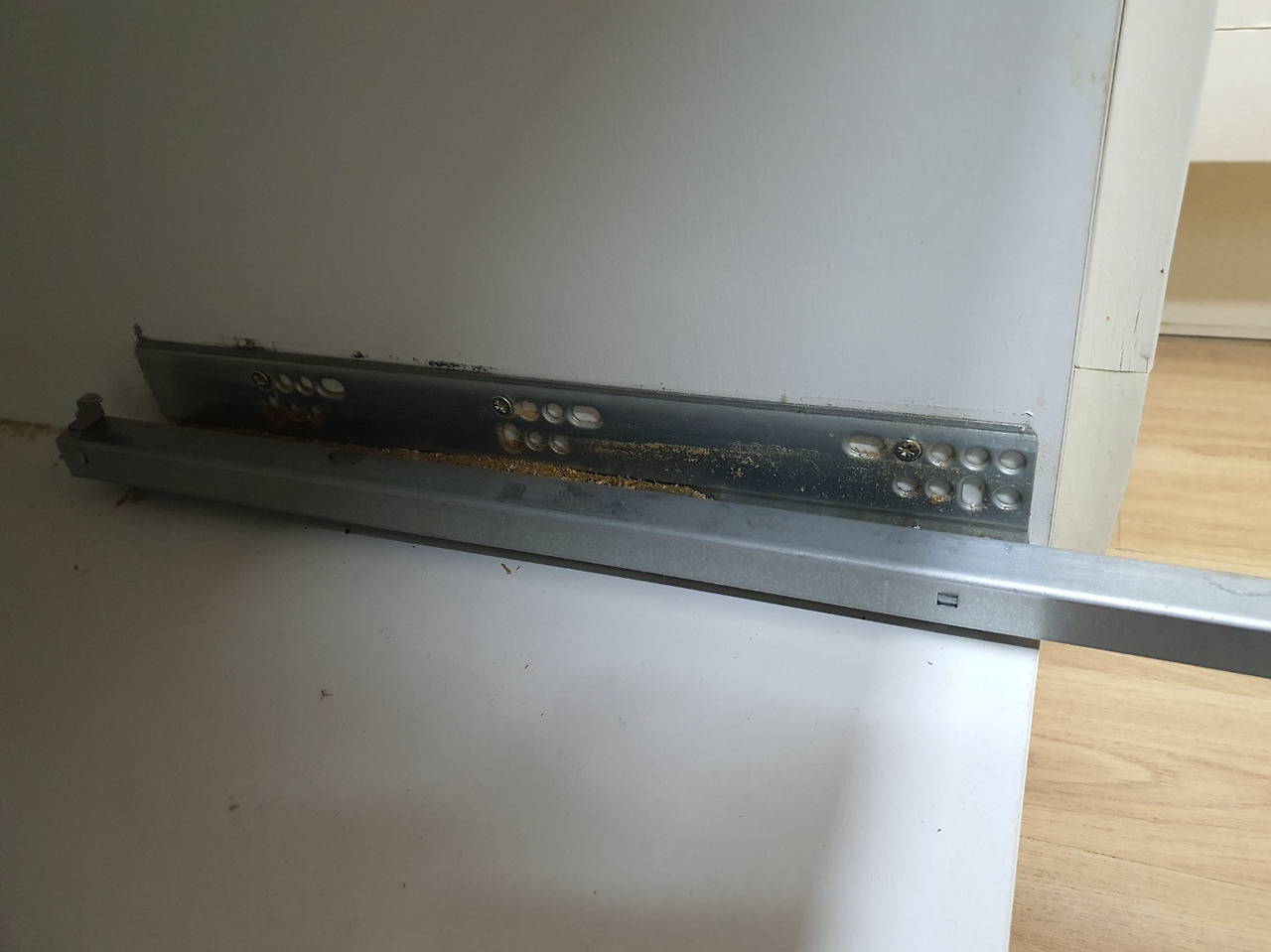 막 정리하려는 순간, 서랍이 잘 안 닫힌다고 하신다. 서랍을 살펴보니 레일 쪽에 결속나사들이 헐거워져 있었고 서랍에 체결되어 있던 나사가 달아나고 없어 덜컹거렸다. 레일을 고정하고 서랍에 맞는 부품을 찾아 체결하니 서랍이 부드럽게 제 기능을 찾았다.