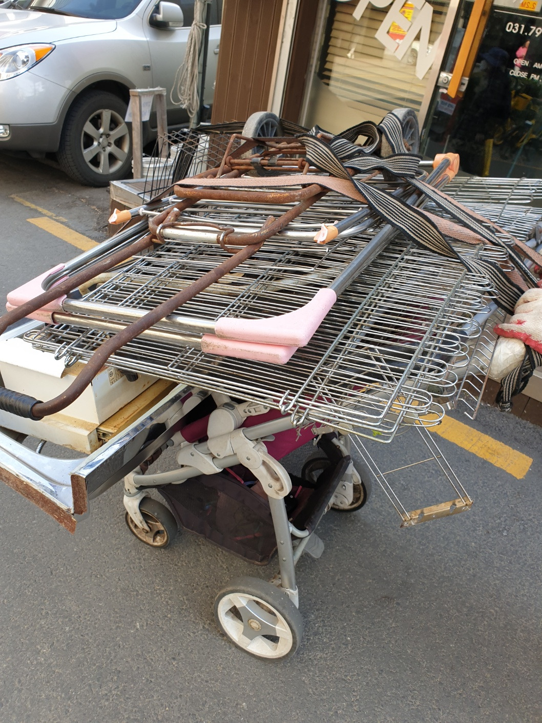 어르신이 가리키시는 유모차를 확인해 보니 알루미늄판으로 널찍하니 덧대어 짐을 실을 수 있도록 개조해 놓으셨다. 무엇부터 실어드리면 되겠냐고 여쭤보았다. 어르신은 싱크대스테인리스보올과 문짝에서 떼어낸 철 경첩들, 환풍기, 가스레인지, 반려견 쇠창살, 녹난 손수레, 스테인리스 빨래건조대 등 철붙이들은 죄다 가져가시겠다고 실어달라고 하신다.