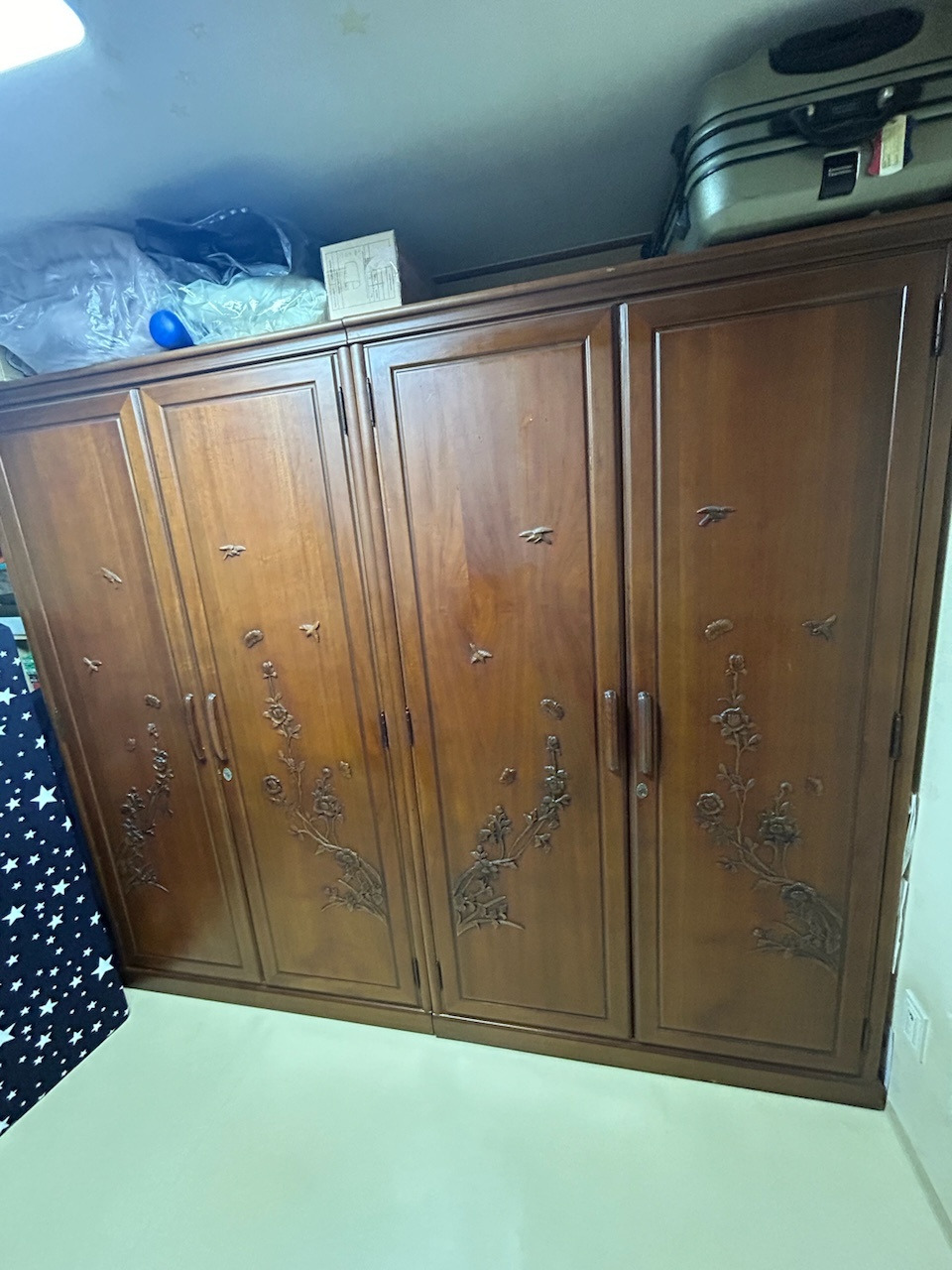 짐을 정리하고 나오려는데 어르신이 조심스럽게 말씀하셨다. 옷장에 문을 고정해 주는 나무 부분이(옷장문 래치) 떨어졌는데 달아줄 수 있겠냐고 하셨다. 어르신의 옷장을 살펴보니 이 옷장 또한 매우 오래된 것으로 보였다. 얼마나 된 옷장인지 여쭤보니 햇수는 모르시고 젊었을 때부터 버리지 못하고 이사 때마다 가지고 다니셨다고 했다. 오동나무로 만든 옷장이라는 것을 매우 강조하셨다. 옷장은 나무로 만든 장식이 붙어 있을 정도로 옛날 물건인 티가 확 났다. 옷장의 떨어져 나간 래치가 워낙 작아 그냥 피스못으로 고정하면 그대로 갈라질 것처럼 보였다. 조심스럽게 드릴로 구멍을 내고 중심에 피스못으로 고정하니 단단하게 고정이 되었다. 어르신은 매우 좋아하셨다.