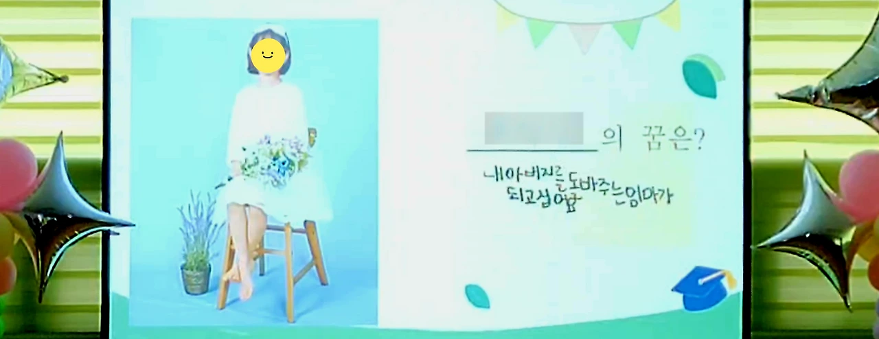 드디어 내 아이의 차례가 되었다. 스크린 위로 환하게 웃는 아이의 얼굴이 나타났다. '○○○의 꿈은?'이라는 질문 아래에 천천히 떠오르는 글자들...