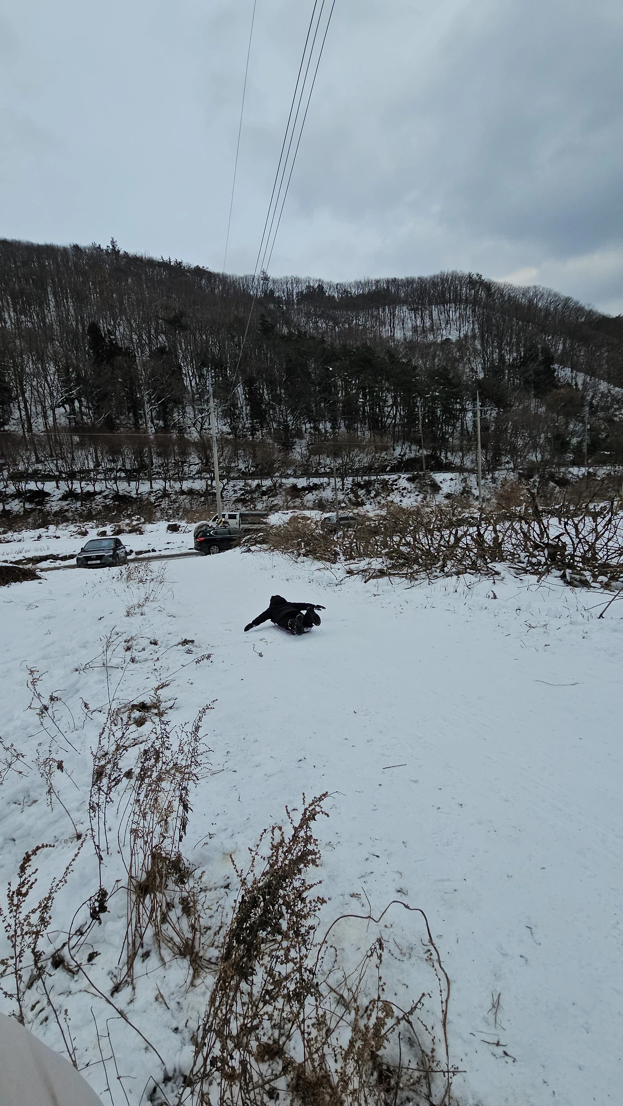 눈이 며칠 동안 펑펑 오고 며칠이 지난 뒤, 같은 학교 학부모의 집 근처로 눈썰매를 타러 다녀왔다.