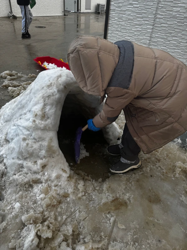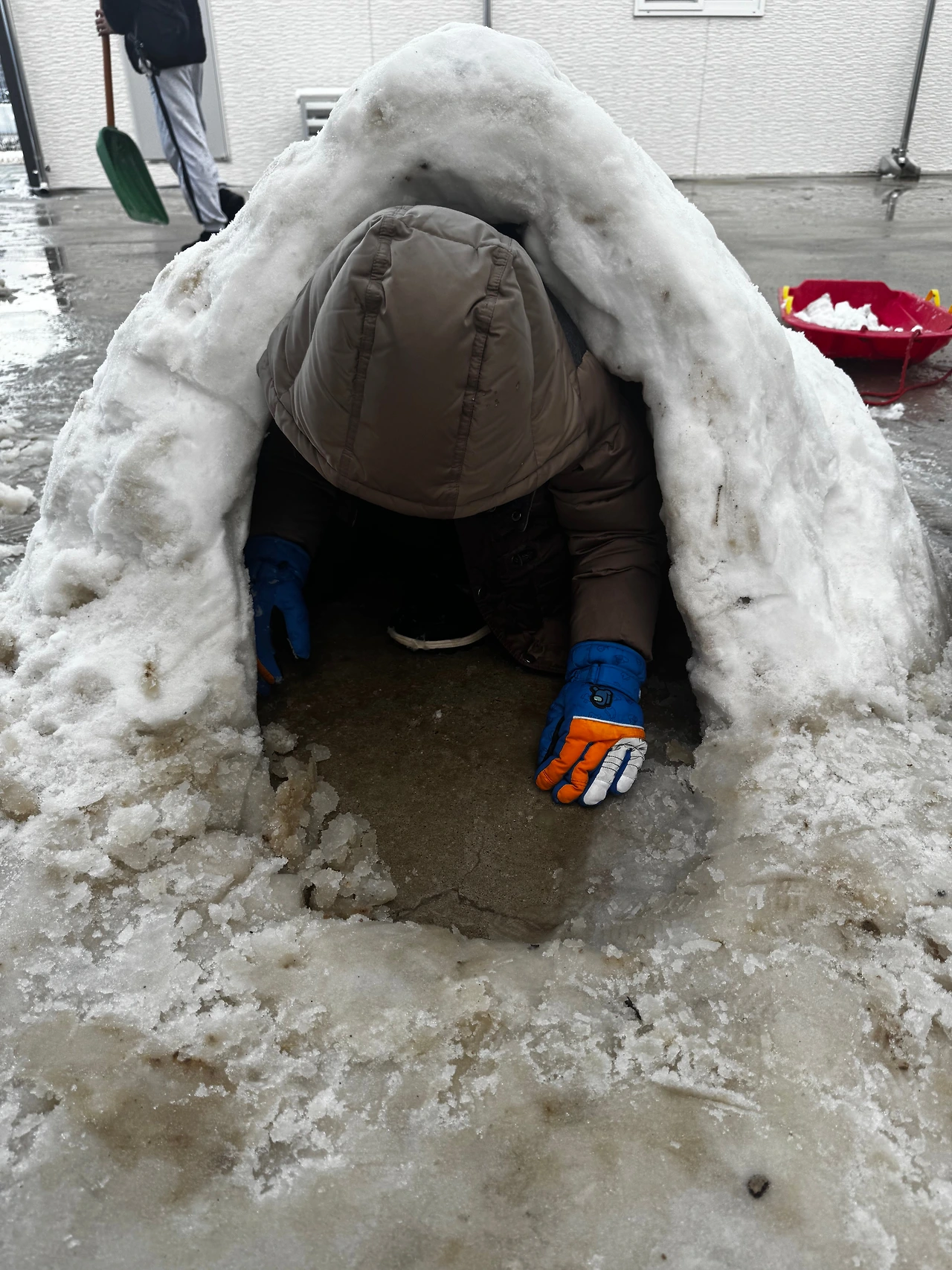 그리고 눈을 쓸고 모으더니 이글루를 만들기 시작했다.