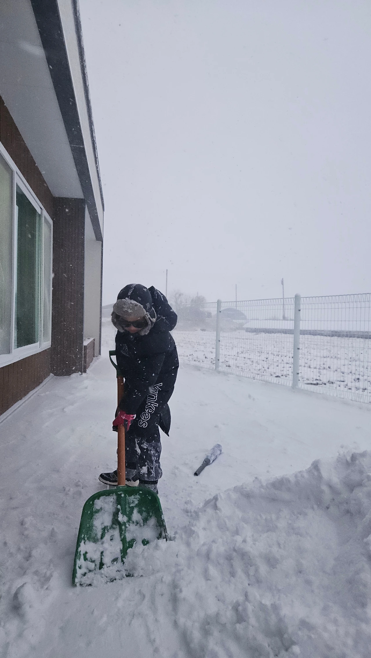 선글라스 쓰고 열심히 눈을 쓸어 모으고 있었다.