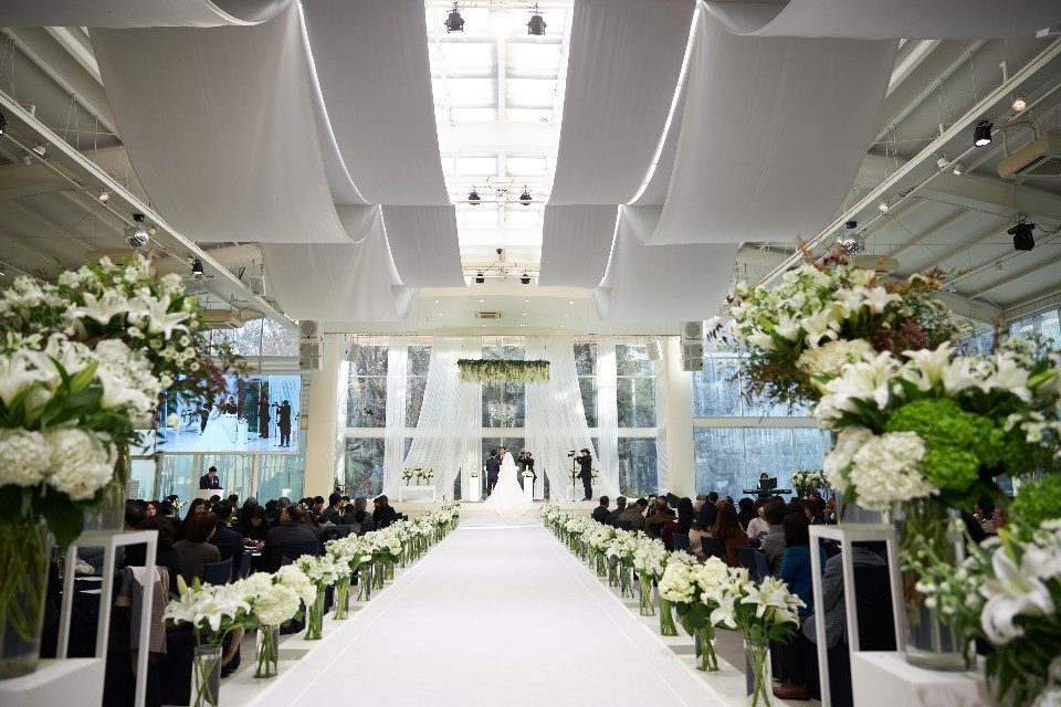 우리가 정한 웨딩홀. 화이트톤의 4면 통창의 자연광 웨딩홀. (사진은 우리 결혼식 당일의 모습)