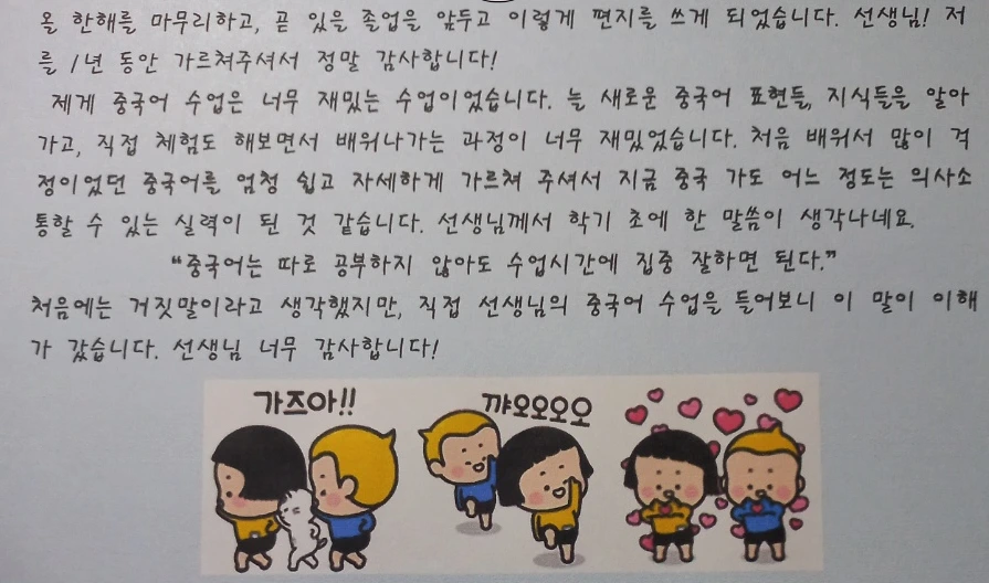 "이 치트키가 언젠가 너희에게 너희의 능력치를 한 단계 레벨업 시켜줄지 누가 알겠니. 취업할 때 외국어로 가산점을 받기도 하는데 말이야. 선생님도 중국어에는 1도 관심이 없다가 학교에서 처음 배운 중국어가 너무 재밌어서 중국어를 좋아하게 되고 중국학과를 진학했을 뿐인데, 지금 이렇게 중국어 교사가 될 줄 누가 알았겠어."