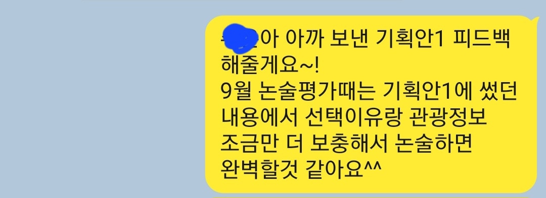 두 번째는, 1대 1 오픈채팅방을 활용한 피드백이다. 1대 1 오픈채팅방은 코로나19로 인해 대면수업을 하지 못하고 원격수업을 진행하던 때에 고안해 낸 방법이다. 학생들이 등교를 하지 않았기 때문에 배움 노트를 걷을 수 없었고 개별적인 피드백을 받자고 중국어 수업을 듣는 모든 학생들에게 내 개인적인 연락처를 알려줄 수도 없는 노릇이었다.