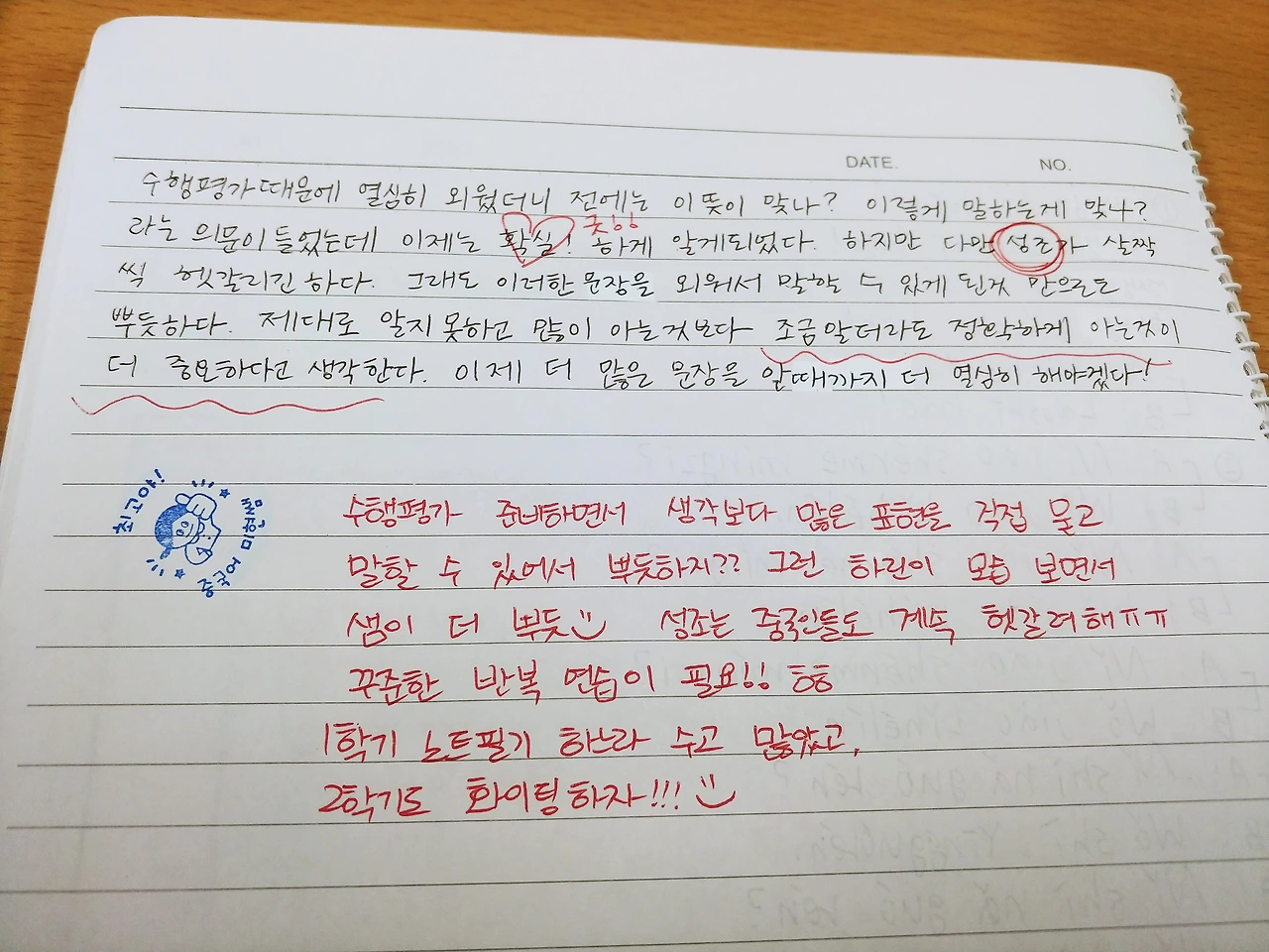 '그렇지, 나도 사춘기 때는 남들 앞에서 공개적 질문을 하는 게 참 어려웠었지.' 하며 배움 노트 한 장 한 장을 정성껏 읽어보며 빨간펜을 집어든다. 내가 써준 피드백 내용이 마치 편지를 주고받는 것처럼 여겨지는지, 배움 노트 내는 날을 기다리는 학생들이 생기기 시작했고 학생들의 기대감 덕분에 나의 빨간펜은 쉴 틈이 없어졌다.